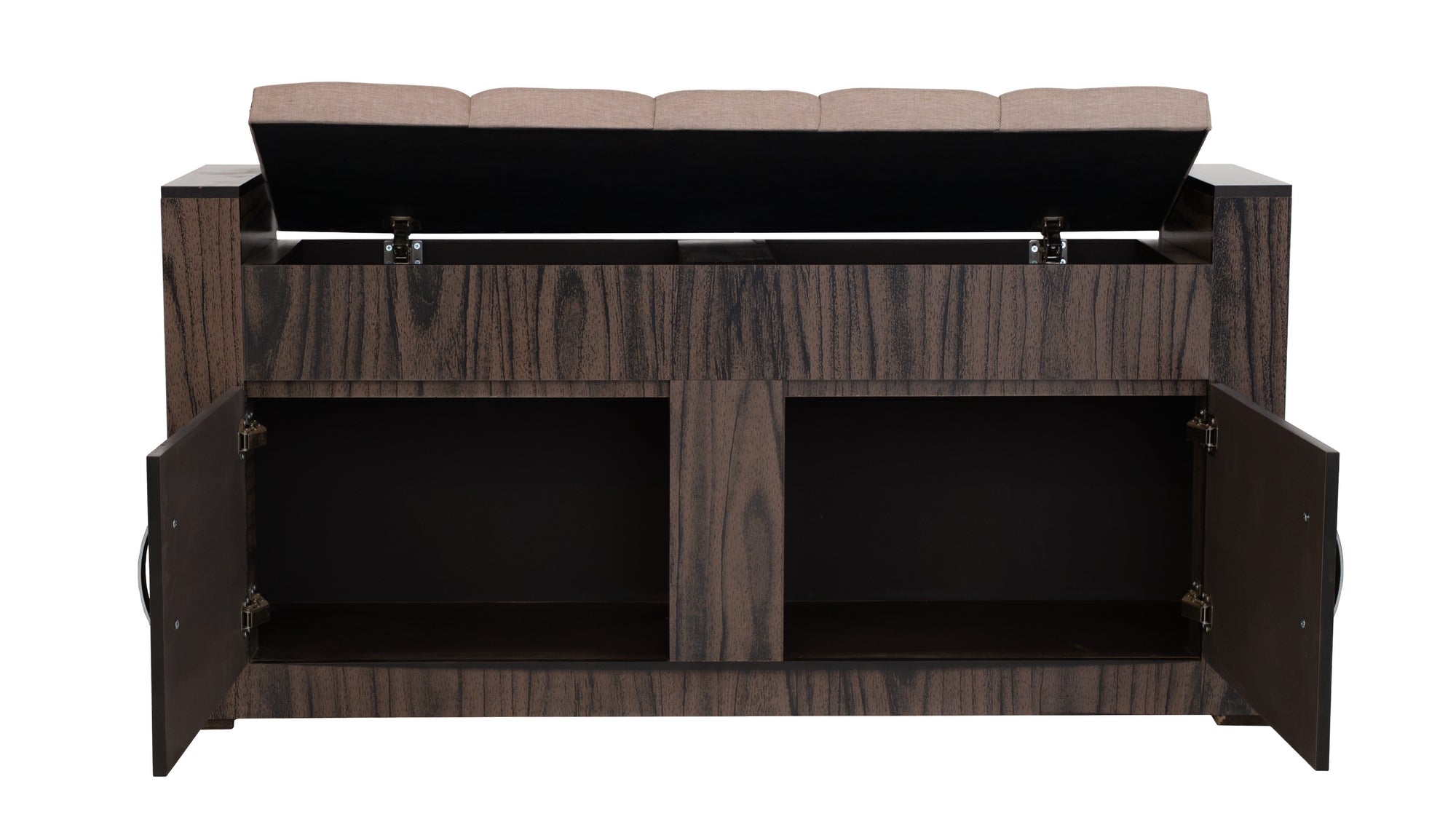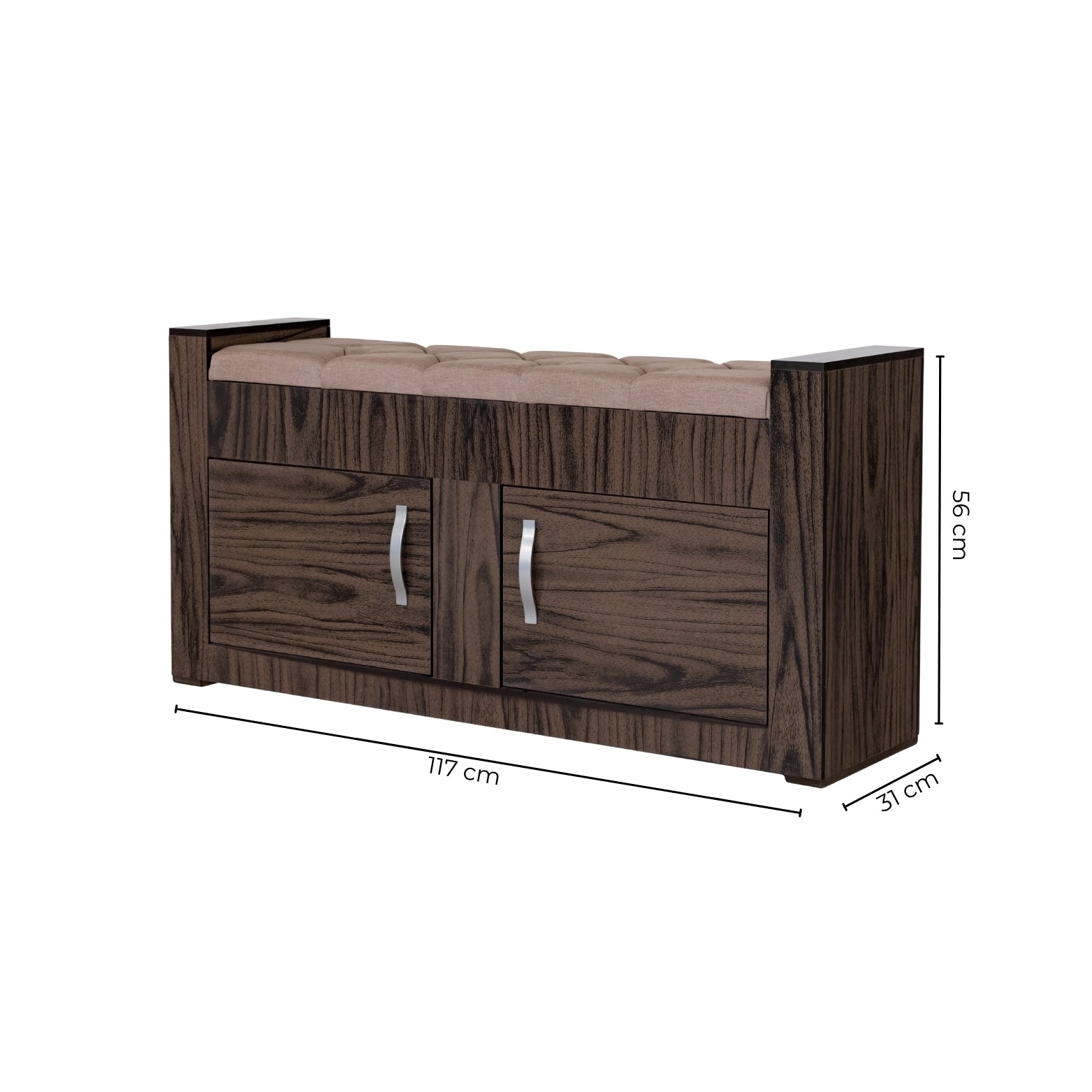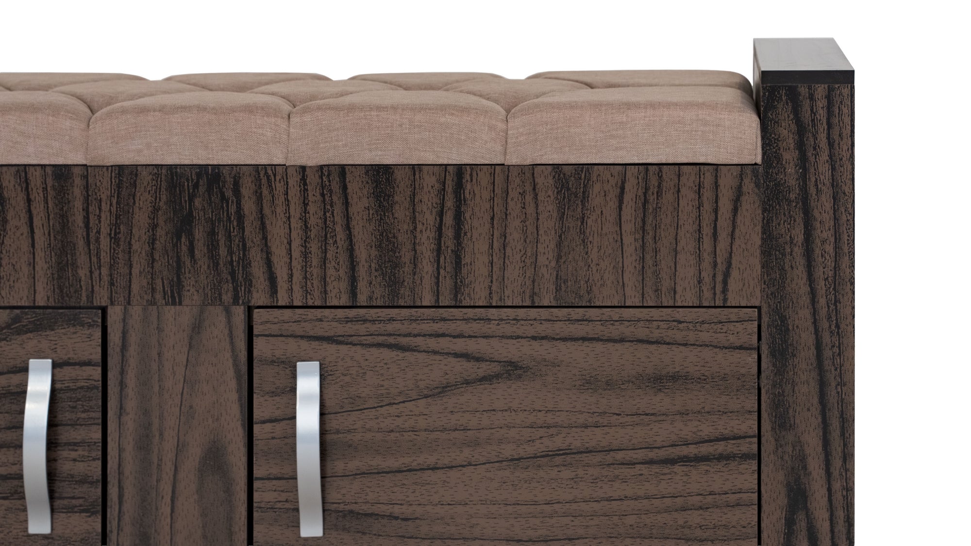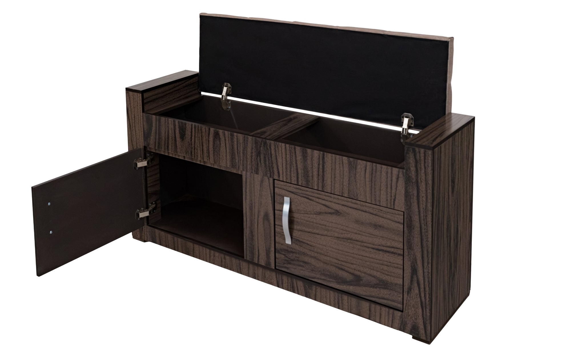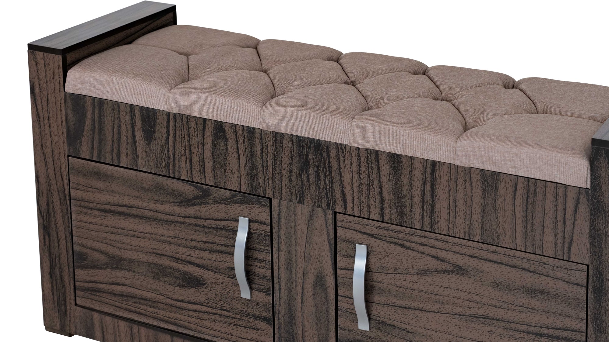 Descripción: Agrega funcionalidad y estilo a tu recámara con este baúl tipo banca tapizada. Su diseño práctico integra dos compartimentos interiores ideales para almacenar ropa de cama, cojines o accesorios, ayudándote a mantener el orden en tu espacio. La banca superior acolchonada ofrece un asiento cómodo, perfecto para complementar el pie de cama, el vestidor o cualquier rincón del hogar. Fabricado con materiales de alta calidad y acabados elegantes tipo madera, este baúl combina almacenamiento inteligente con diseño decorativo, elevando la funcionalidad de cualquier habitación. |