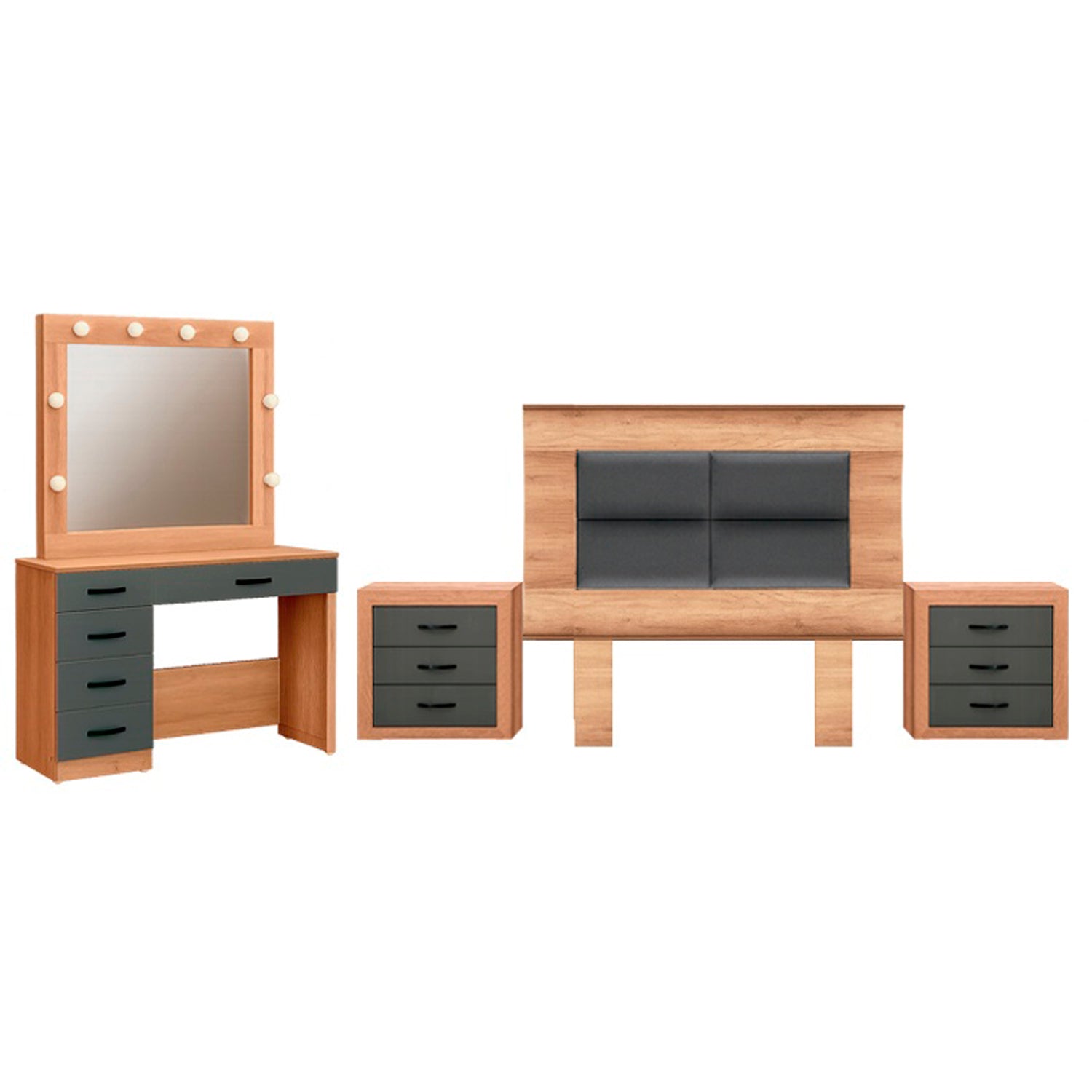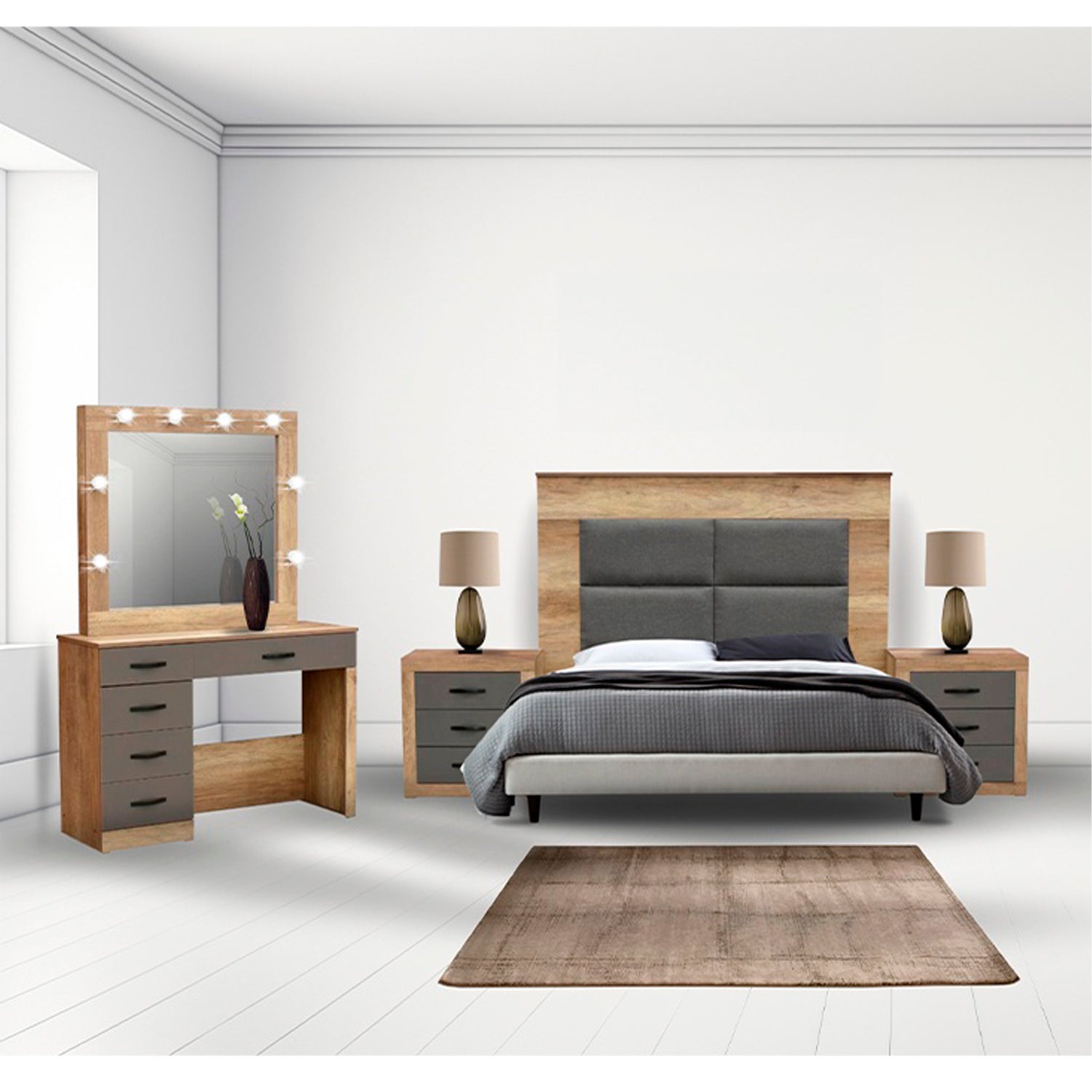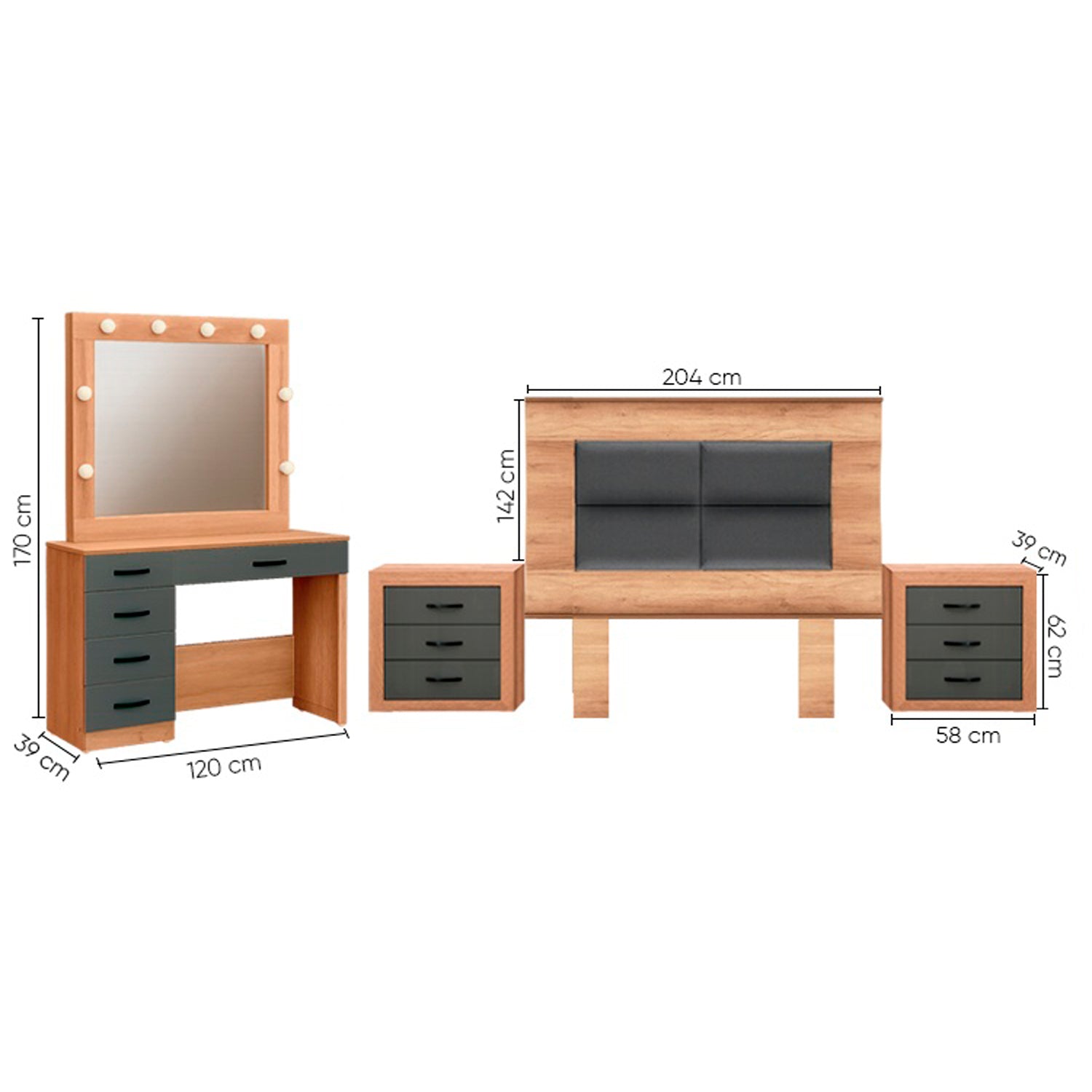 Descripción: Fabricado en Madera y Melamina. Con acabado en color Roble. Medidas: 204 x 142 x 6 cm. Cabecera 204 x 142 x 6 Buro 58 x 62 x 39 Maquillador 120 x 170 x 39. No incluye base ni colchon. NOTA: Los accesorios y otros muebles de las fotografías, se venden por separado. Por efectos de iluminación de la fotografía, algunos tonos de colores pueden variar con respecto al color real. |