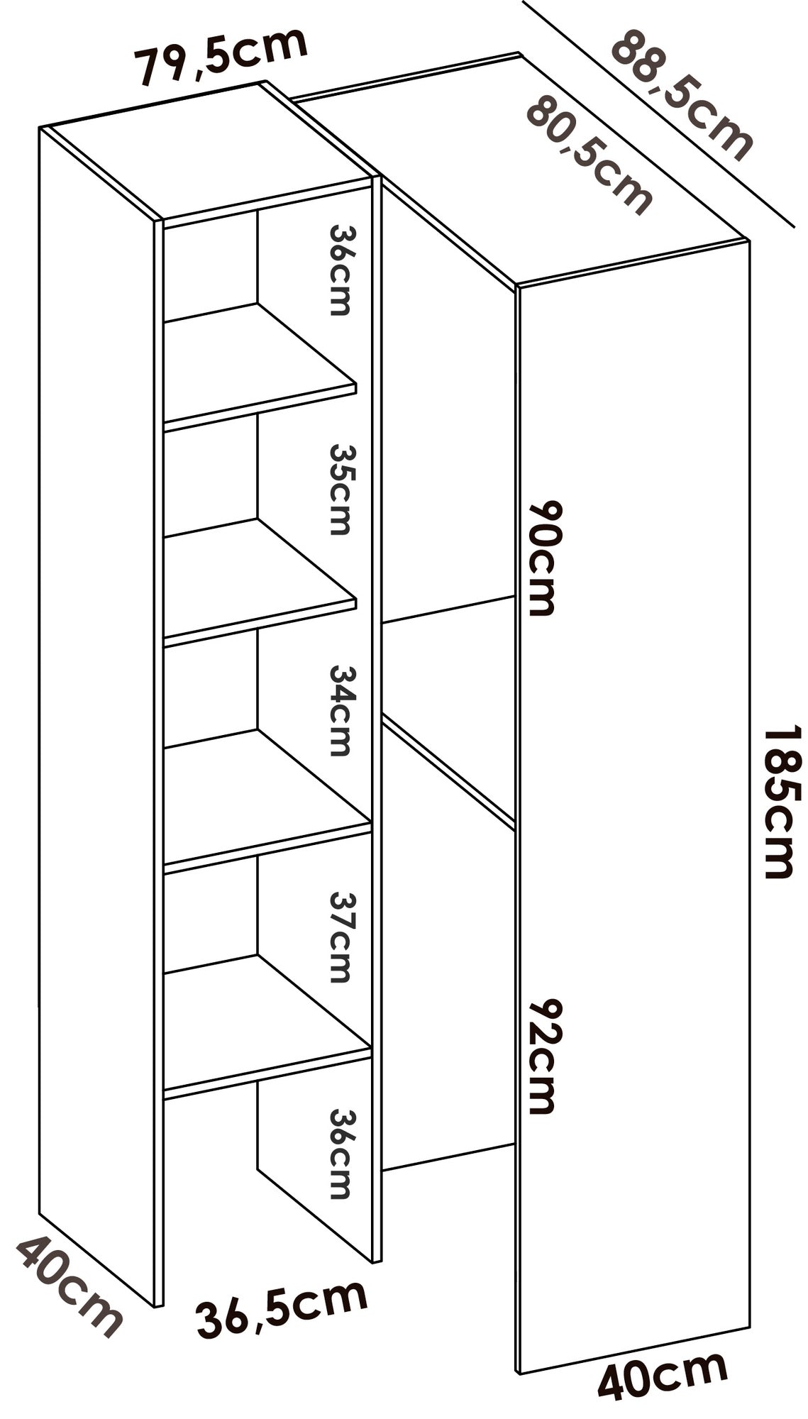 Descripción:  Fabricado en Madera/MDF. Con acabado en color Blanco. Medidas: 79 x 186 x 88 cm. Clóset esquinero con 5 compartimentos laterales y 2 barras de colgar metálicas ajustables.. NOTA: Los accesorios y otros muebles de las fotografías, se venden por separado. Por efectos de iluminación de la fotografía, algunos tonos de colores pueden variar con respecto al color real.  |