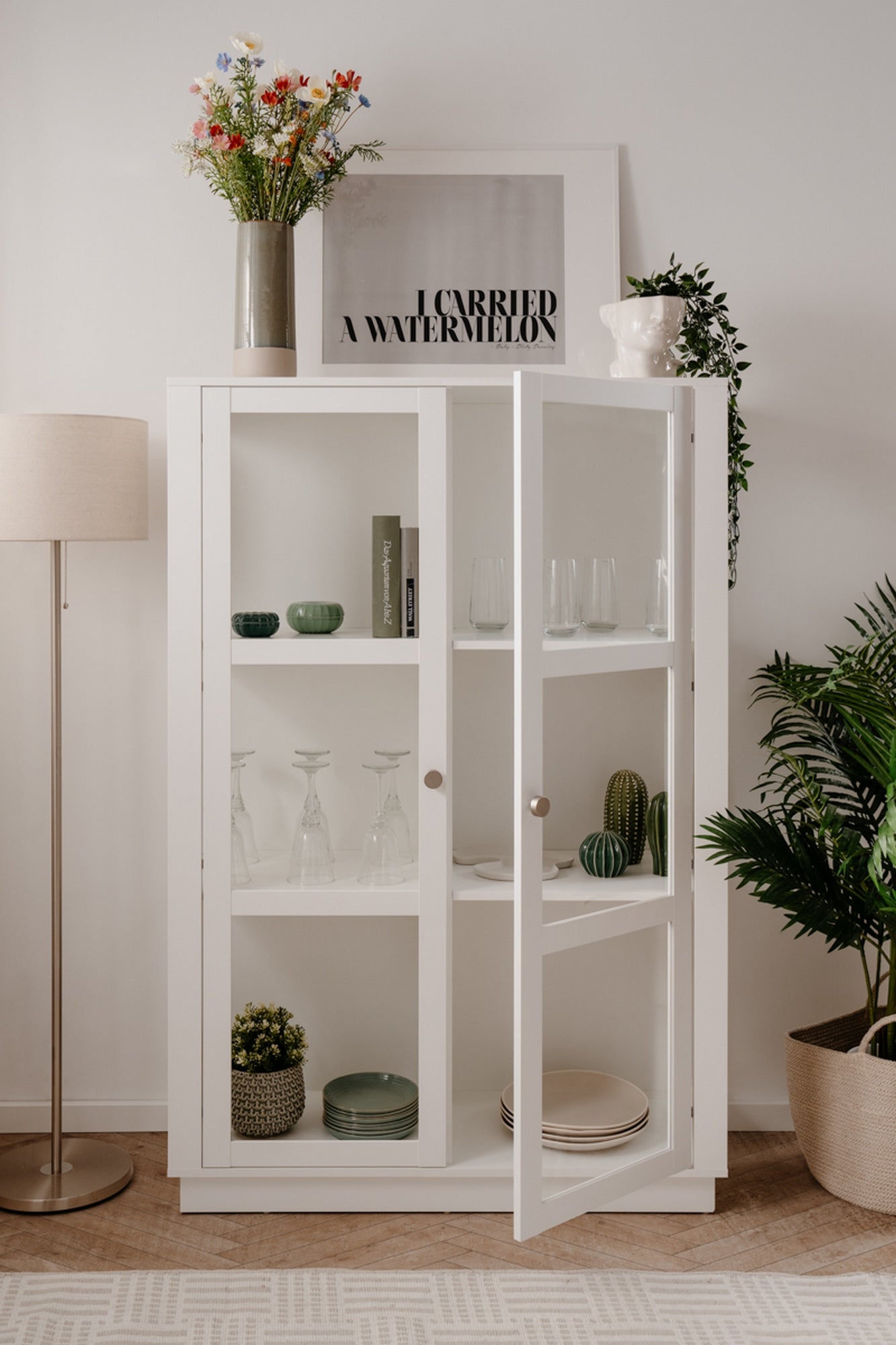 Descripción: Fabricado en Madera/MDF. Con acabado en color Blanco. Medidas: 100 x 150 x 40 cm. Vitrina con puertas enmarcadas y laterales enmarcados con paneles de vidrio. Bordes de ABS, asas de metal, dos puertas de vidrio con marco y dos laterales e vidrio con marco, dos entrepaños en el interior.. NOTA: Los accesorios y otros muebles de las fotografías, se venden por separado. Por efectos de iluminación de la fotografía, algunos tonos de colores pueden variar con respecto al color real. |