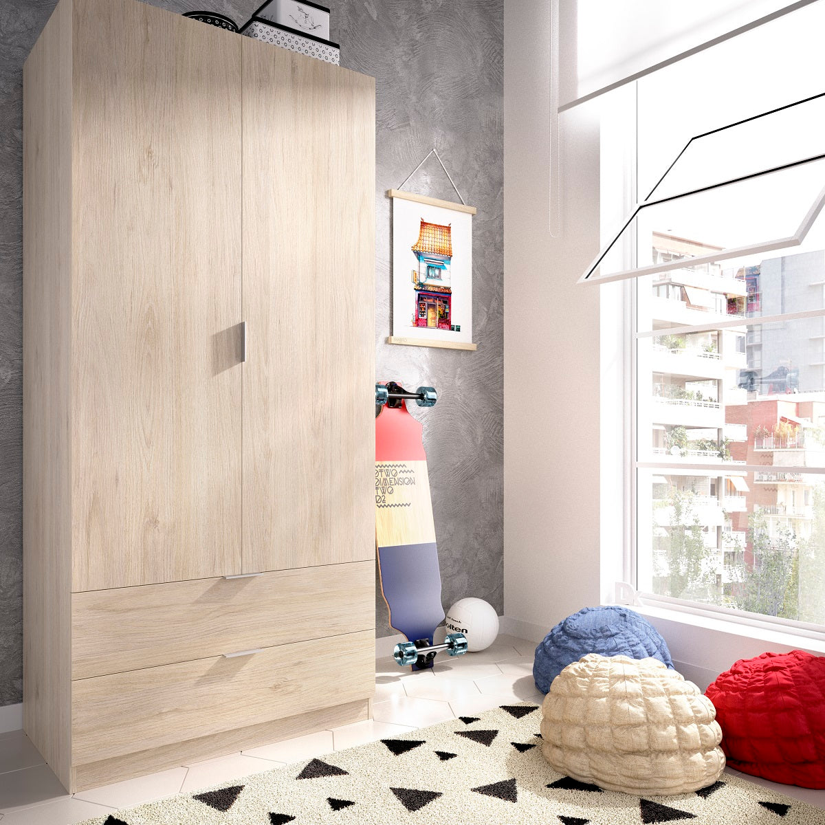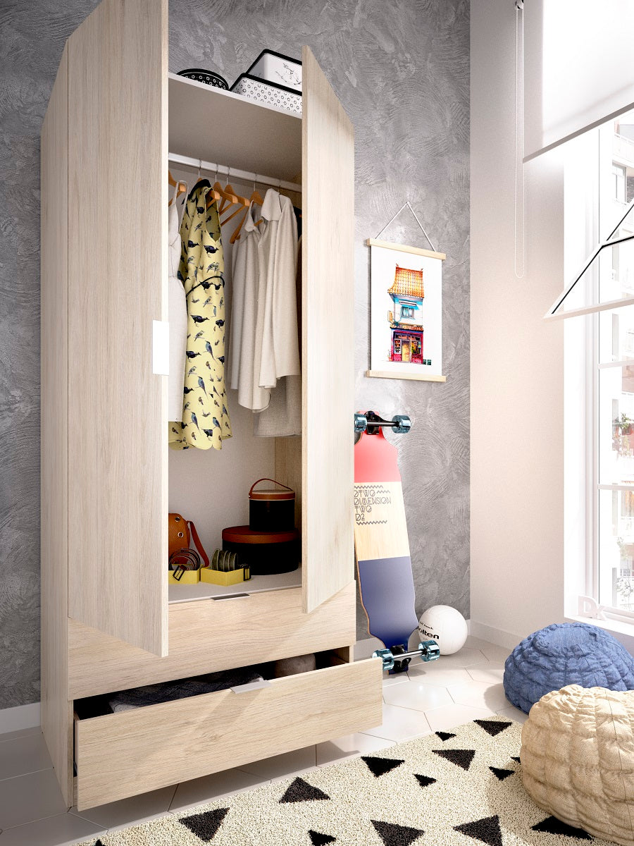 Descripción: Fabricado en Madera industrializada . Con acabado en color Roble. Medidas: 81 x 184 x 52 cm. Armario con 2 puertas de apertura lateral y 2 cajones que se deslizan por guías metálicas correderas. 1 barra para colgar la ropa.. NOTA: Los accesorios y otros muebles de las fotografías, se venden por separado. Por efectos de iluminación de la fotografía, algunos tonos de colores pueden variar con respecto al color real. |
