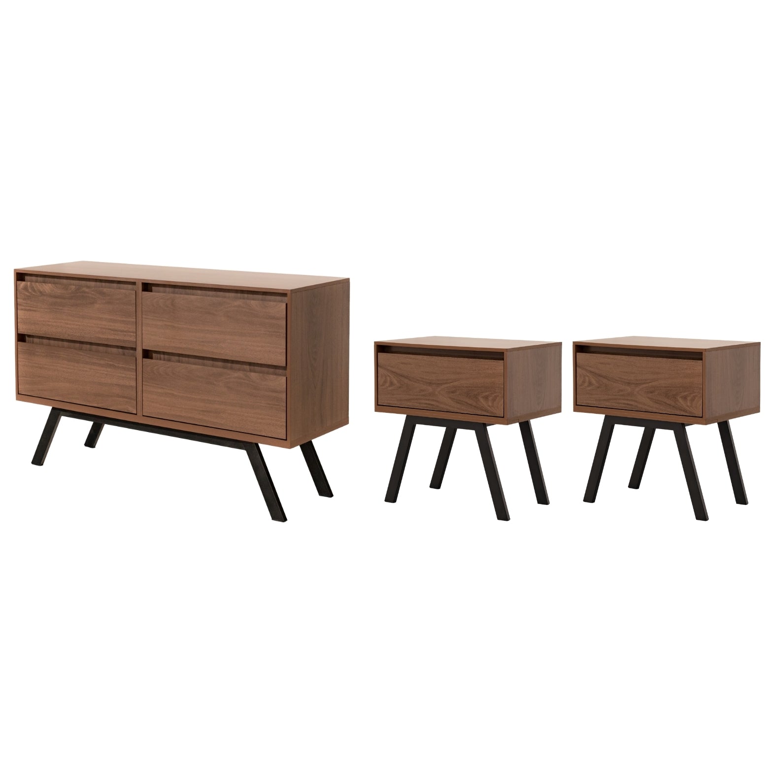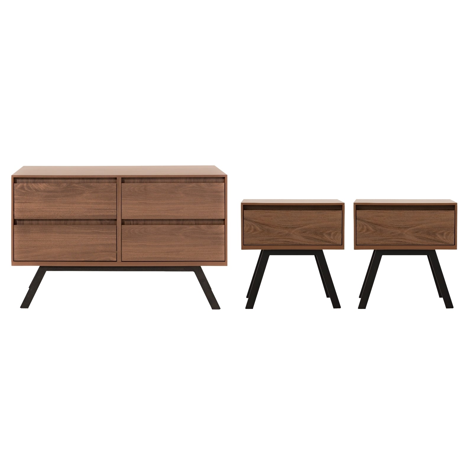 Fabricado en Fabricado en Melamina de alta calidad para mayor durabilidad. Con acabado en color Nogal. Medidas: 120 x 75 x 40 cm. Cajonera: 120 x 75 x 40. Buro: 60 x 63 x 40. Dale un nuevo aire a tu recámara con este combo funcional y elegante que incluye una cajonera y 2 burós. Cada pieza está fabricada con materiales de alta calidad que garantizan resistencia y durabilidad, mientras que su diseño versátil se adapta fácilmente a distintos estilos de decoración. Este set es perfecto para quienes buscan mantener su espacio ordenado sin renunciar al estilo. Las mesas de noche ofrecen almacenamiento práctico para lo esencial de todos los días, mientras que la cómoda brinda amplio espacio para ropa, accesorios u objetos personales. Además, los muebles se entregan completamente armados, listos para usarse desde el primer momento. Funcionalidad, estética y comodidad en un solo paquete.. NOTA: Los accesorios y otros muebles de las fotografías, se venden por separado. Por efectos de iluminación de la fotografía, algunos tonos de colores pueden variar con respecto al color real.