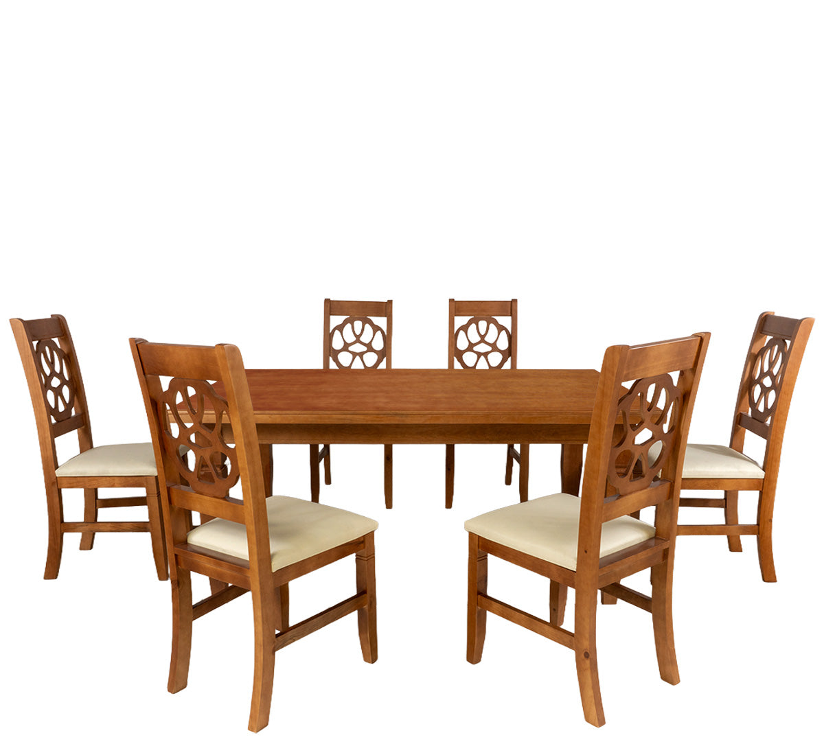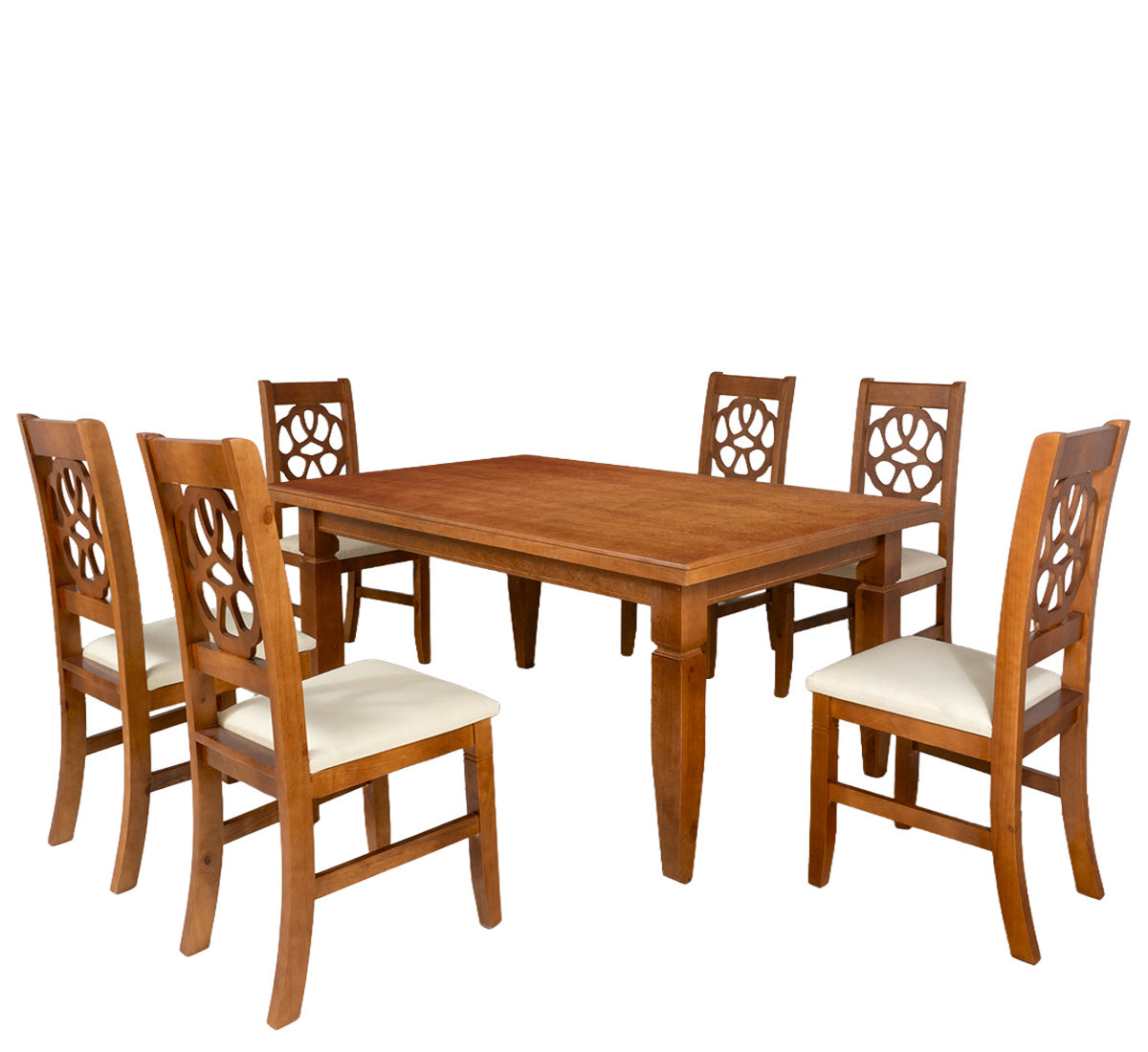 Descripción: Hermoso comedor de 6 sillas. Fabricado en madera estufada y tratada contra plagas y tablero industrializado de madera con acabado semi brillante color nogal. Sillas fabricadas en madera con mismo acabado, tapizadas en tactopiel sintetica color crema. Incluye 6 sillas. Medidas: 175 x 112 x 76. NOTA: Los accesorios y otros muebles de las fotografías, se venden por separado. Por efectos de iluminación de la fotografía, algunos tonos de colores pueden variar con respecto al color real. |
