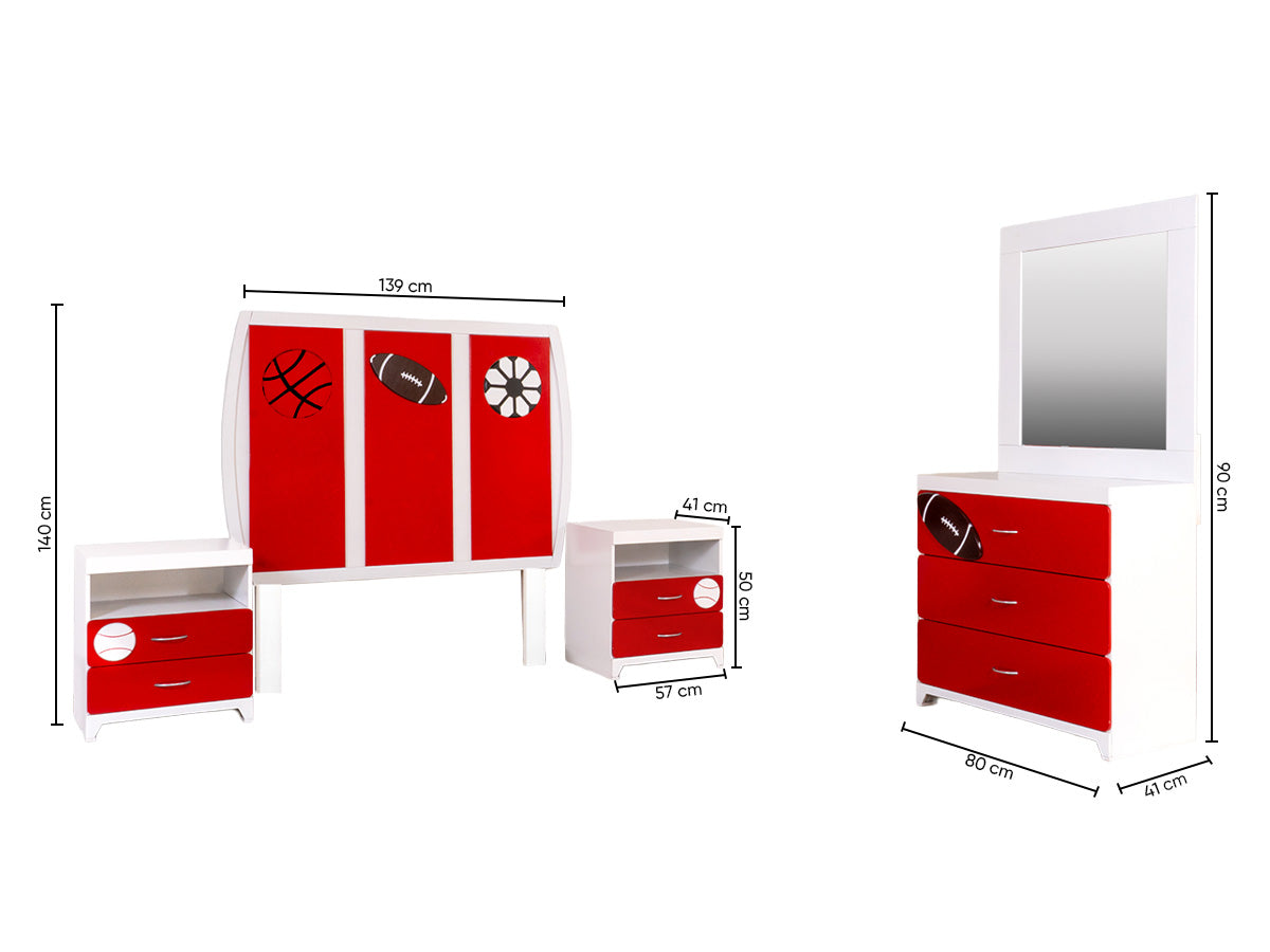 Descripción: Recamara 5 Piezas. Disponible en Rojo, Azul y Wengue. Medidas: 139 x 140 x 10 cm. Fabricado en Madera de Pino y Melamina. Medidas Buro 50 x 57 x 41. Medidas Tocador 80 x 90 x 41. No incluye Base ni Colchon. NOTA: Los accesorios y otros muebles de las fotografías, se venden por separado. Por efectos de iluminación de la fotografía, algunos tonos de colores pueden variar con respecto al color real. |