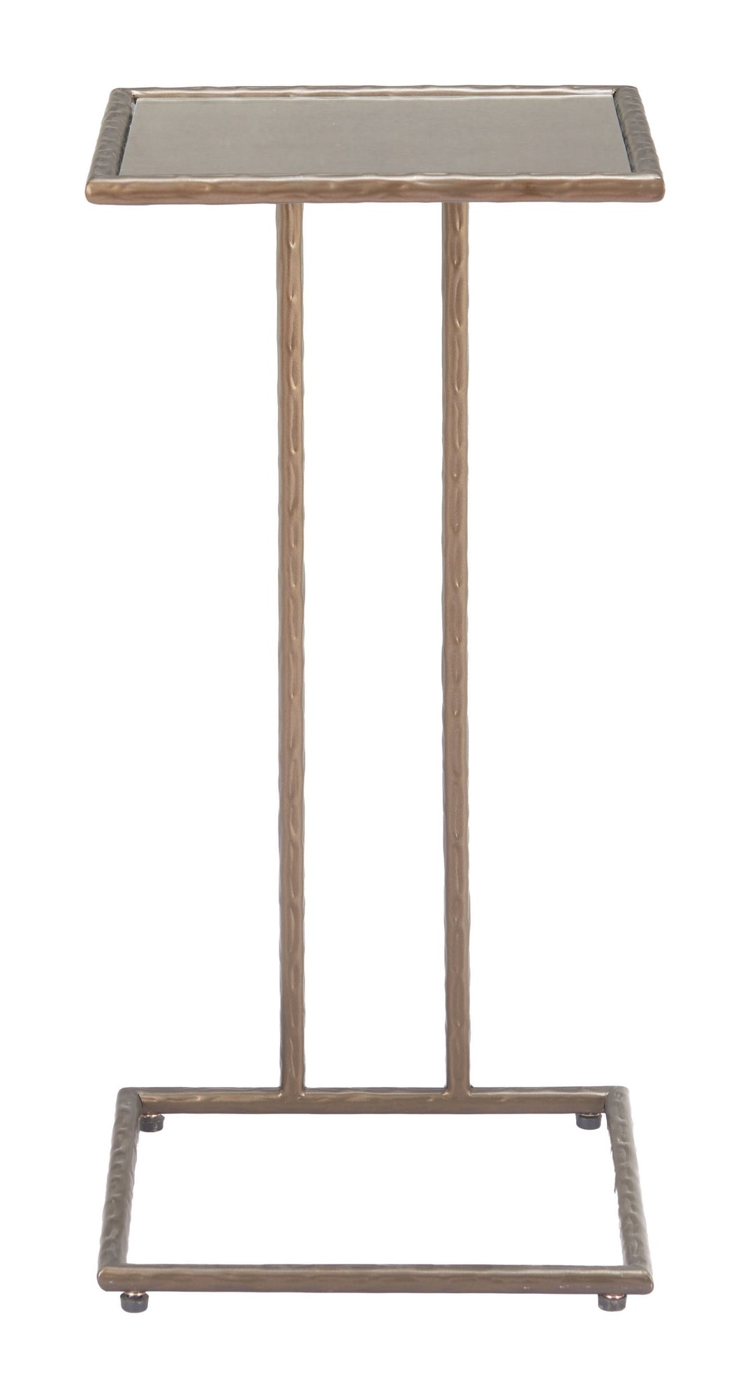 Fabricado en Acero. Con acabado en color Bronce. Medidas: 30 x 62 x 30 cm. La mesa auxiliar Ringen Bronze aporta un toque moderno y encantador a tu sala de estar con su diseño refinado y su práctica construcción. Fabricada en vidrio y acero, es un complemento elegante para tu sofá o mesita de noche, ofreciendo un lugar práctico para guardar objetos esenciales o decoración. Su elegante silueta y estilo contemporáneo la hacen perfecta para cualquier interior de inspiración bohemia o minimalista.. NOTA: Los accesorios y otros muebles de las fotografías, se venden por separado. Por efectos de iluminación de la fotografía, algunos tonos de colores pueden variar con respecto al color real.