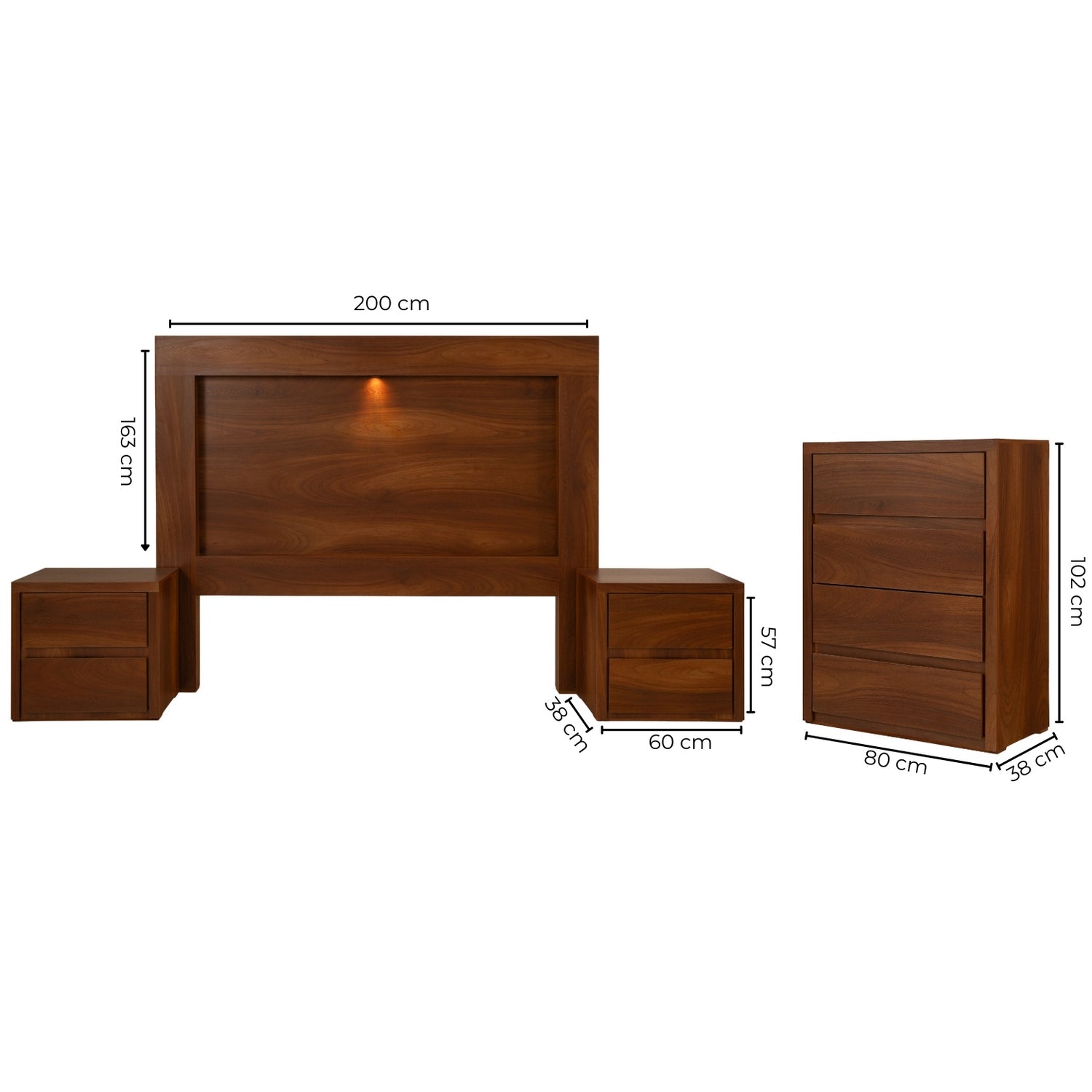 Descripción: Descubre la fusión perfecta entre elegancia y diseño con este set de recámara completa, que incluye: una cabecera con luz integrada, ideal para un colchón tamaño king; dos burós, cuyo diseño versátil y almacenamiento eficiente mantiene la armonía y el orden; y una amplia cómoda cajonera, para mantener todo organizado. Su diseño elegante y funcional aporta estilo y sofisticación al ambiente. Todos los productos fueron fabricados con materiales duraderos y un diseño atemporal. Se entregan completamente armados para su uso inmediato. Un conjunto perfecto para transformar tu dormitorio en un refugio con estilo y confort.. BASE Y COLCHON NO INCLUIDOS. |