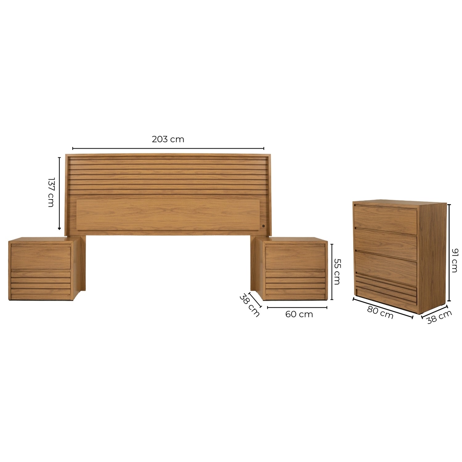 Descripción: Descubre la fusión perfecta entre elegancia y diseño con este set de recámara completa, que incluye: una cabecera con luz integrada, ideal para un colchón tamaño king; dos burós, cuyo diseño versátil y almacenamiento eficiente mantiene la armonía y el orden; y una amplia cómoda cajonera, para mantener todo organizado. Su diseño elegante y funcional aporta estilo y sofisticación al ambiente. Todos los productos fueron fabricados con materiales duraderos y un diseño atemporal. Se entregan completamente armados para su uso inmediato. Un conjunto perfecto para transformar tu dormitorio en un refugio con estilo y confort.. BASE Y COLCHON NO INCLUIDOS. |