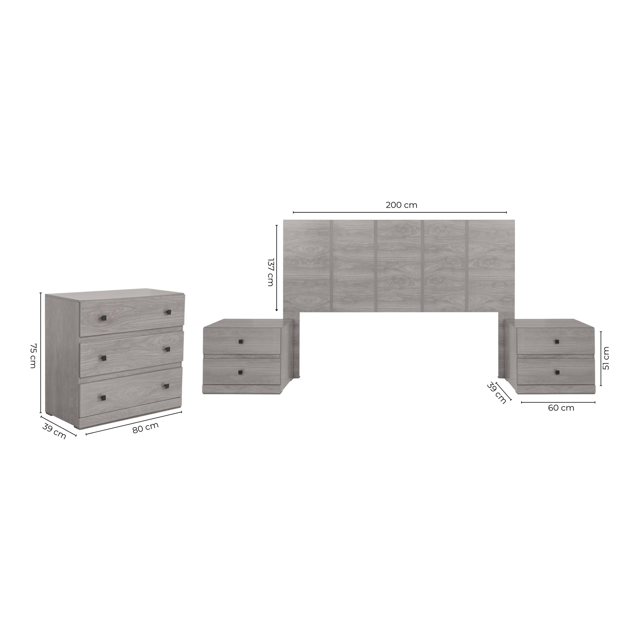 Descripción: Fabricado en Fabricado en Melamina de alta calidad para mayor durabilidad. Con acabado en color Gris. Medidas: 200 x 137 x 7 cm. Buro: 60 x 51 x 39. Cabecera: 200 x 137 x 7. Comoda: 80 x 75 x 39. Descubre la fusión perfecta entre elegancia y diseño con este set de recámara completa, que incluye: una cabecera, ideal para un colchón tamaño king; dos burós, cuyo diseño versátil y almacenamiento eficiente mantiene la armonía y el orden; y una amplia cómoda cajonera, para mantener todo organizado. Su diseño elegante y funcional aporta estilo y sofisticación al ambiente. Todos los productos fueron fabricados con materiales duraderos y un diseño atemporal. Se entregan completamente armados para su uso inmediato. Un conjunto perfecto para transformar tu dormitorio en un refugio con estilo y confort.. BASE Y COLCHON NO INCLUIDOS.. NOTA: Los accesorios y otros muebles de las fotografías, se venden por separado. Por efectos de iluminación de la fotografía, algunos tonos de colores pueden variar con respecto al color real. |