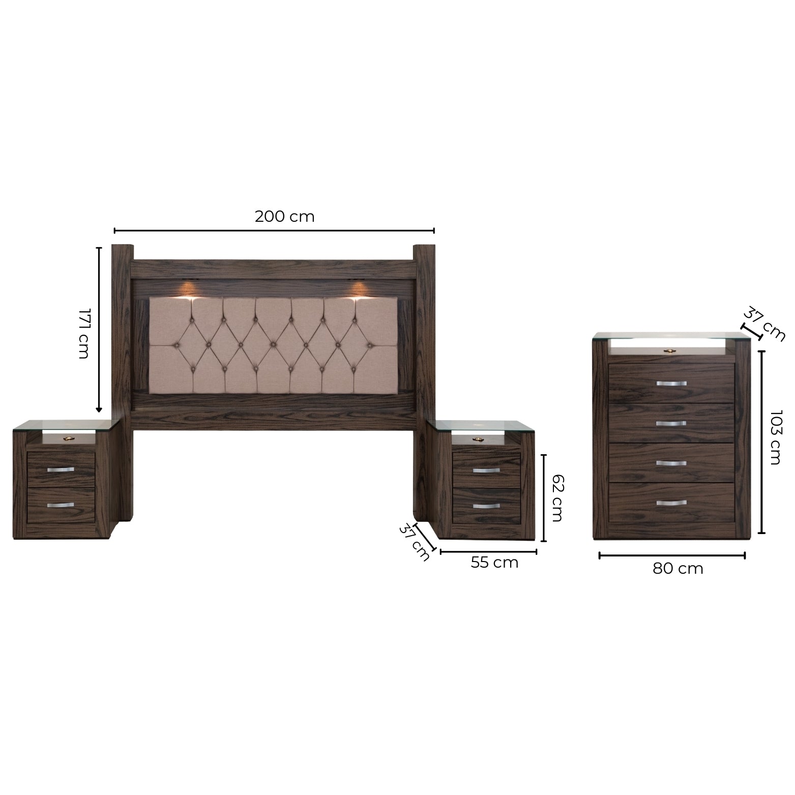 Descripción: Descubre la fusión perfecta entre elegancia y diseño con este set de recámara completa, que incluye: una cabecera, ideal para un colchón tamaño king; dos burós, cuyo diseño versátil y almacenamiento eficiente mantiene la armonía y el orden; y una amplia cómoda cajonera, para mantener todo organizado. Su diseño elegante y funcional aporta estilo y sofisticación al ambiente. Todos los productos fueron fabricados con materiales duraderos y un diseño atemporal. Se entregan completamente armados para su uso inmediato. Un conjunto perfecto para transformar tu dormitorio en un refugio con estilo y confort. No incluye base para cama ni colchón. |