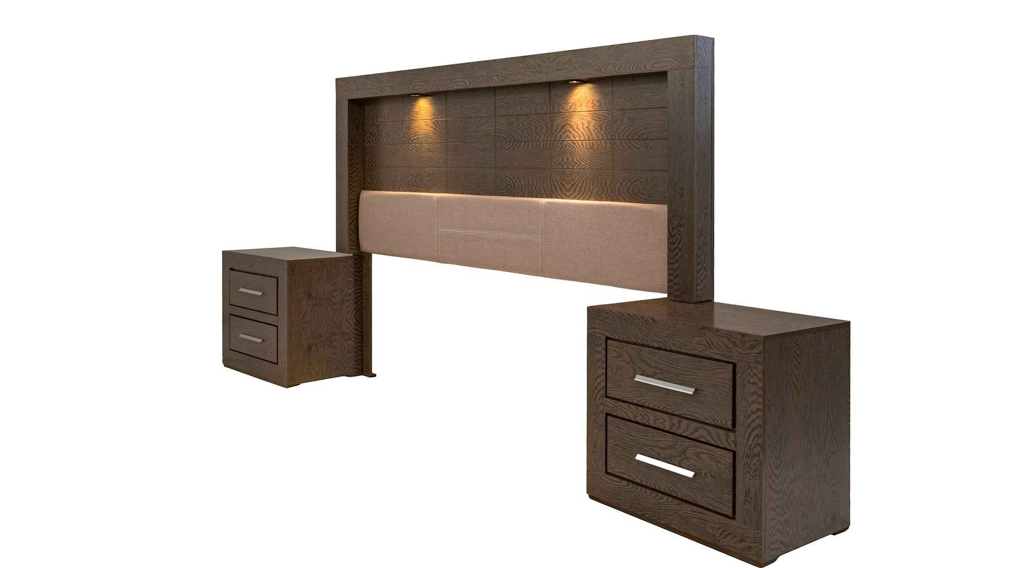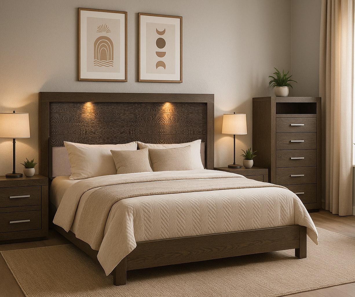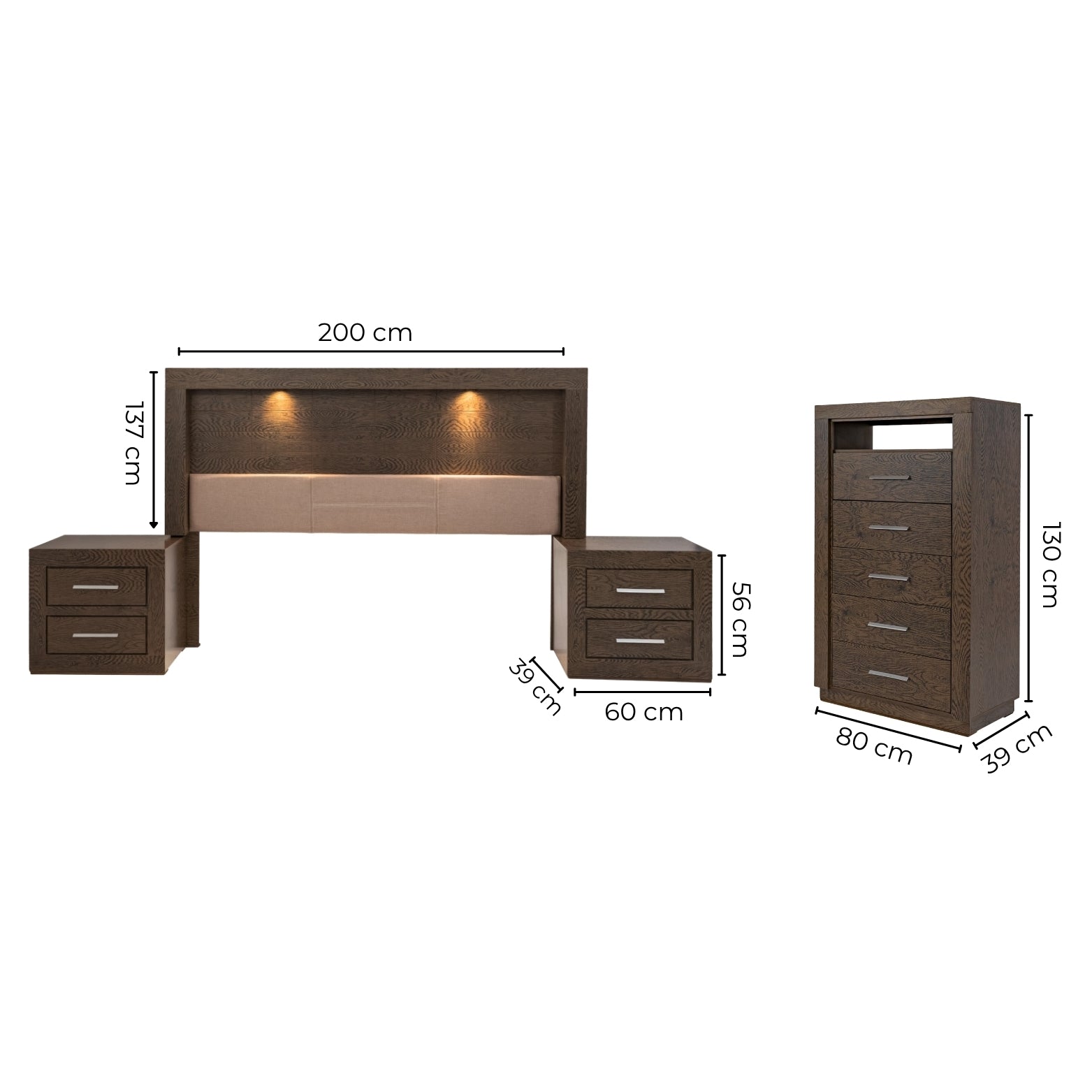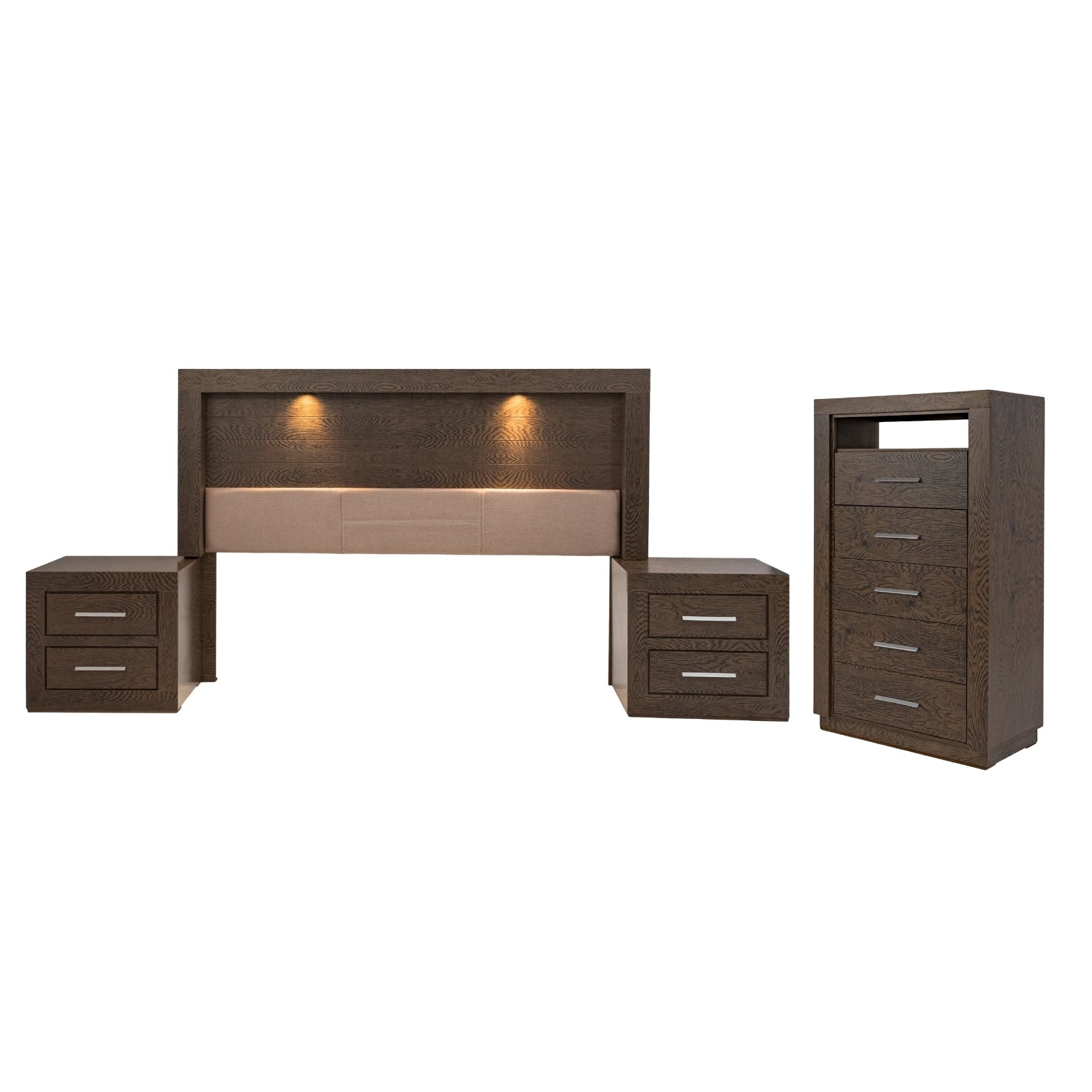 Descripción: Descubre la fusión perfecta entre elegancia y diseño con este set de recámara completa, que incluye: una cabecera con luz integrada, ideal para un colchón tamaño king; dos burós, cuyo diseño versátil y almacenamiento eficiente mantiene la armonía y el orden; y una amplia cómoda cajonera, para mantener todo organizado. Su diseño elegante y funcional aporta estilo y sofisticación al ambiente. Todos los productos fueron fabricados con materiales duraderos y un diseño atemporal. Se entregan completamente armados para su uso inmediato. Un conjunto perfecto para transformar tu dormitorio en un refugio con estilo y confort. No incluye base para cama ni colchón. |