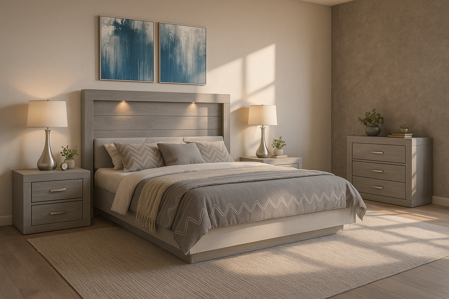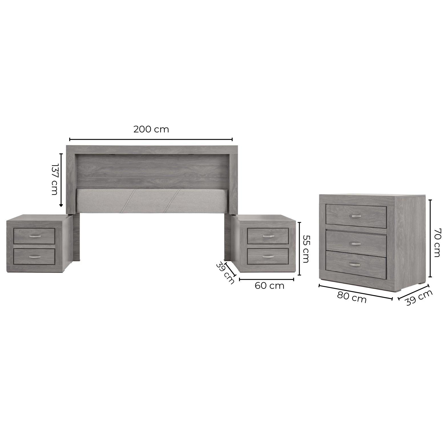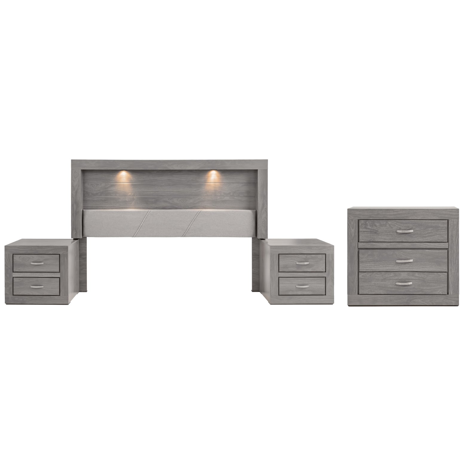 Descripción: Descubre la fusión perfecta entre elegancia y diseño con este set de recámara completa, que incluye: una cabecera con luz integrada, ideal para un colchón tamaño king; dos burós, cuyo diseño versátil y almacenamiento eficiente mantiene la armonía y el orden; y una amplia cómoda cajonera, para mantener todo organizado. Su diseño elegante y funcional aporta estilo y sofisticación al ambiente. Todos los productos fueron fabricados con materiales duraderos y un diseño atemporal. Se entregan completamente armados para su uso inmediato. Un conjunto perfecto para transformar tu dormitorio en un refugio con estilo y confort. No incluye base para cama ni colchón. |