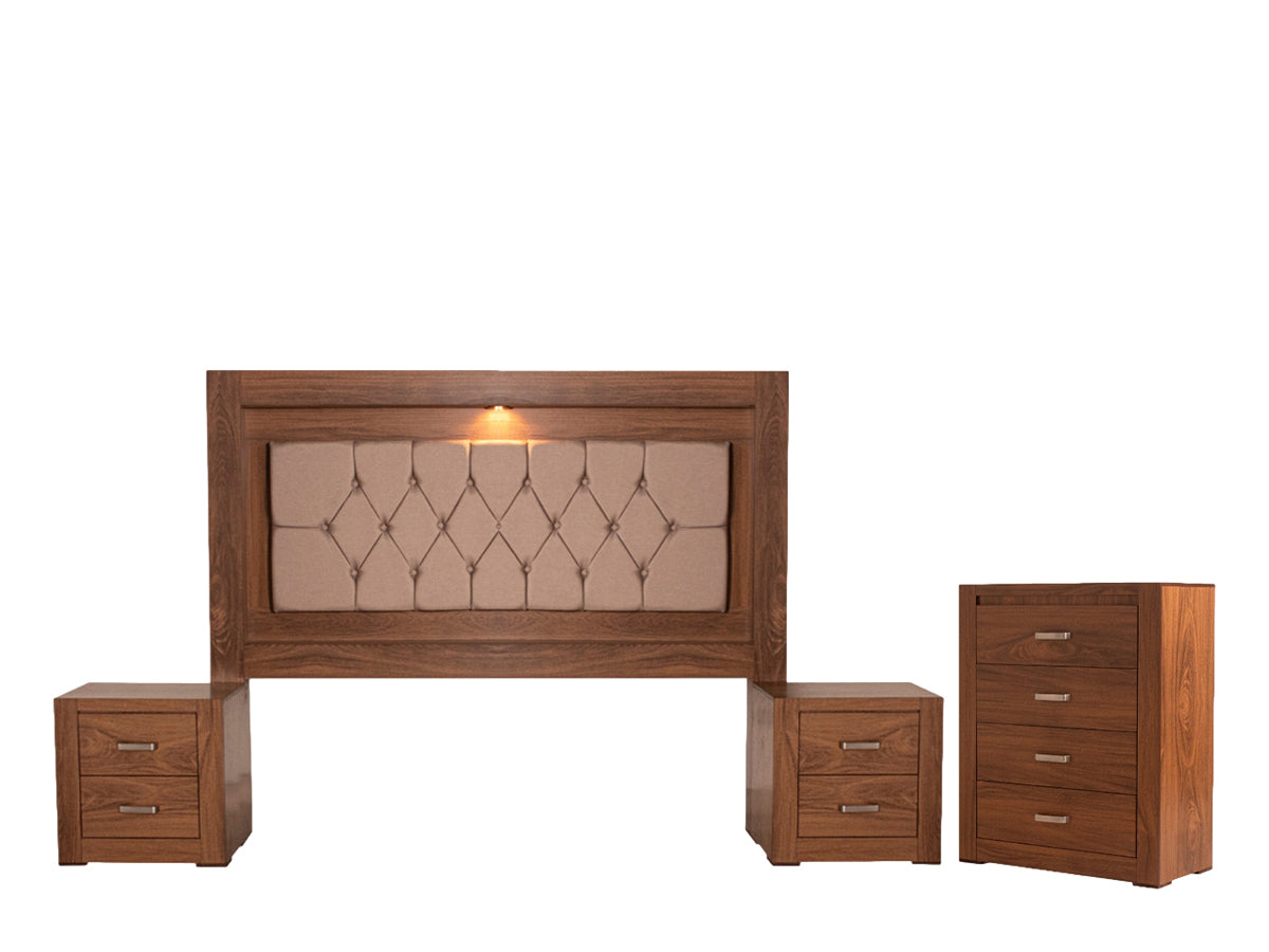 Descripción: Descubre la fusión perfecta entre elegancia y diseño con este set de recámara completa, que incluye: una cabecera, ideal para un colchón tamaño king; dos burós, cuyo diseño versátil y almacenamiento eficiente mantiene la armonía y el orden; y una amplia cómoda cajonera, para mantener todo organizado. Su diseño elegante y funcional aporta estilo y sofisticación al ambiente. Todos los productos fueron fabricados con materiales duraderos y un diseño atemporal. Se entregan completamente armados para su uso inmediato. Un conjunto perfecto para transformar tu dormitorio en un refugio con estilo y confort.. BASE Y COLCHON NO INCLUIDOS. |
