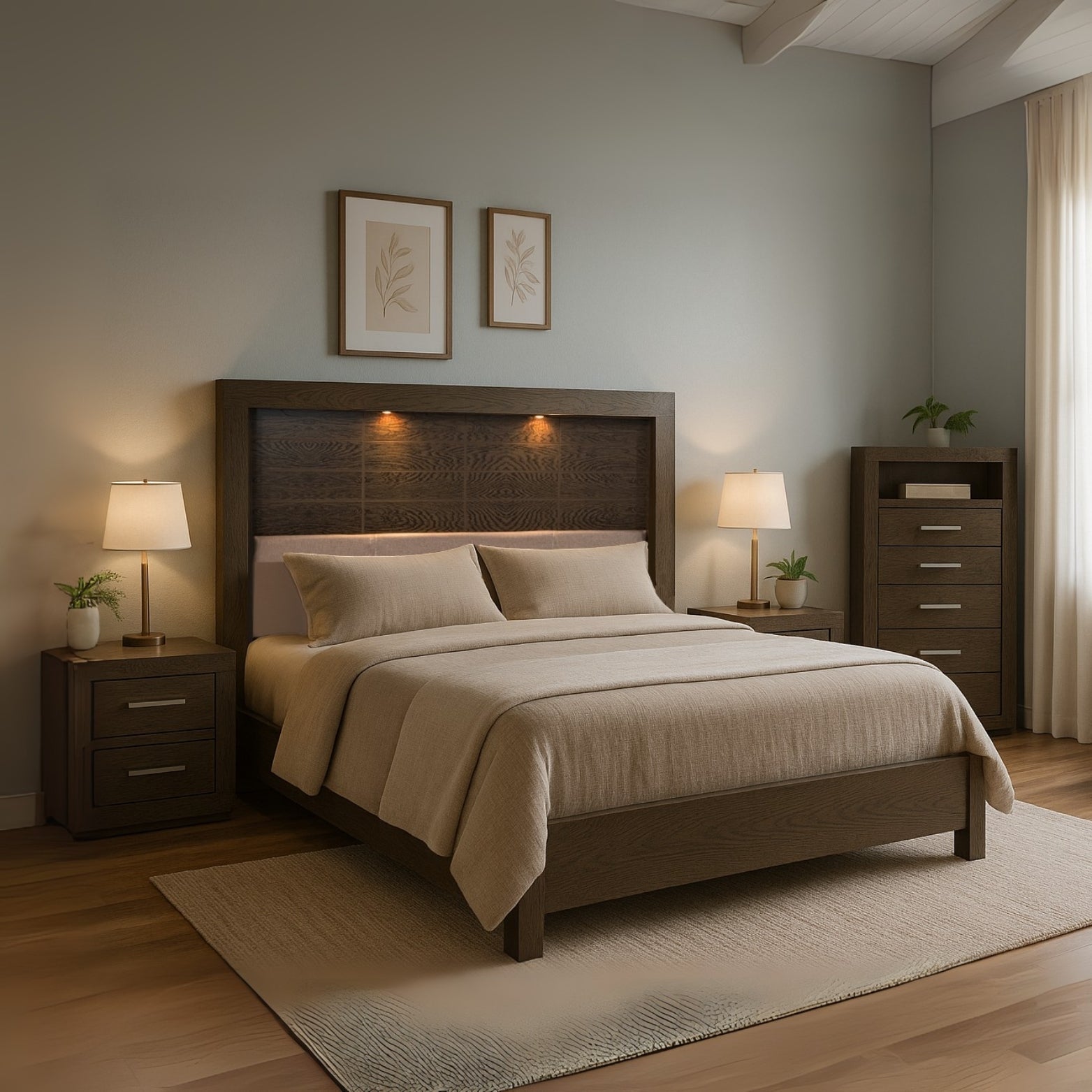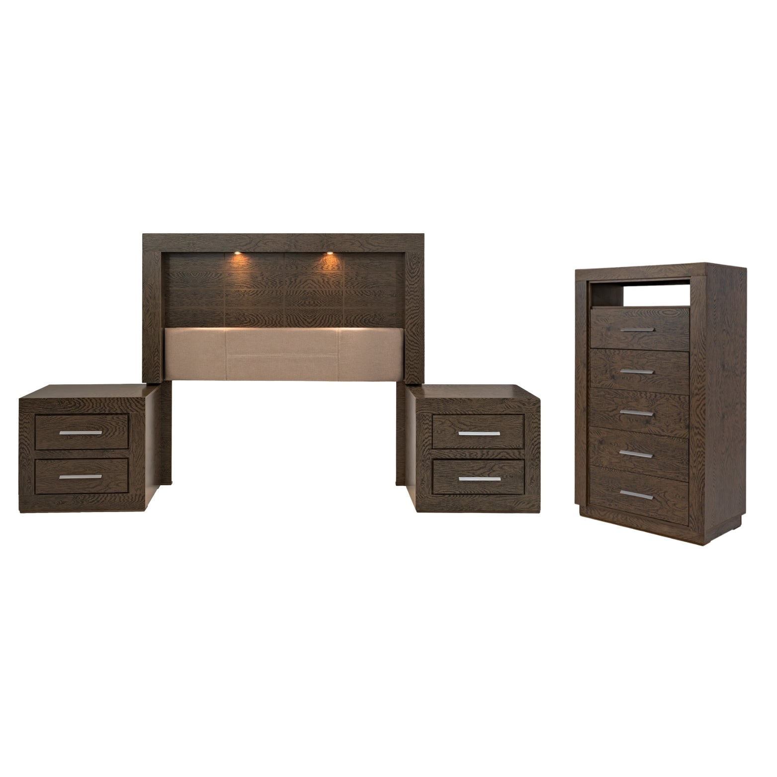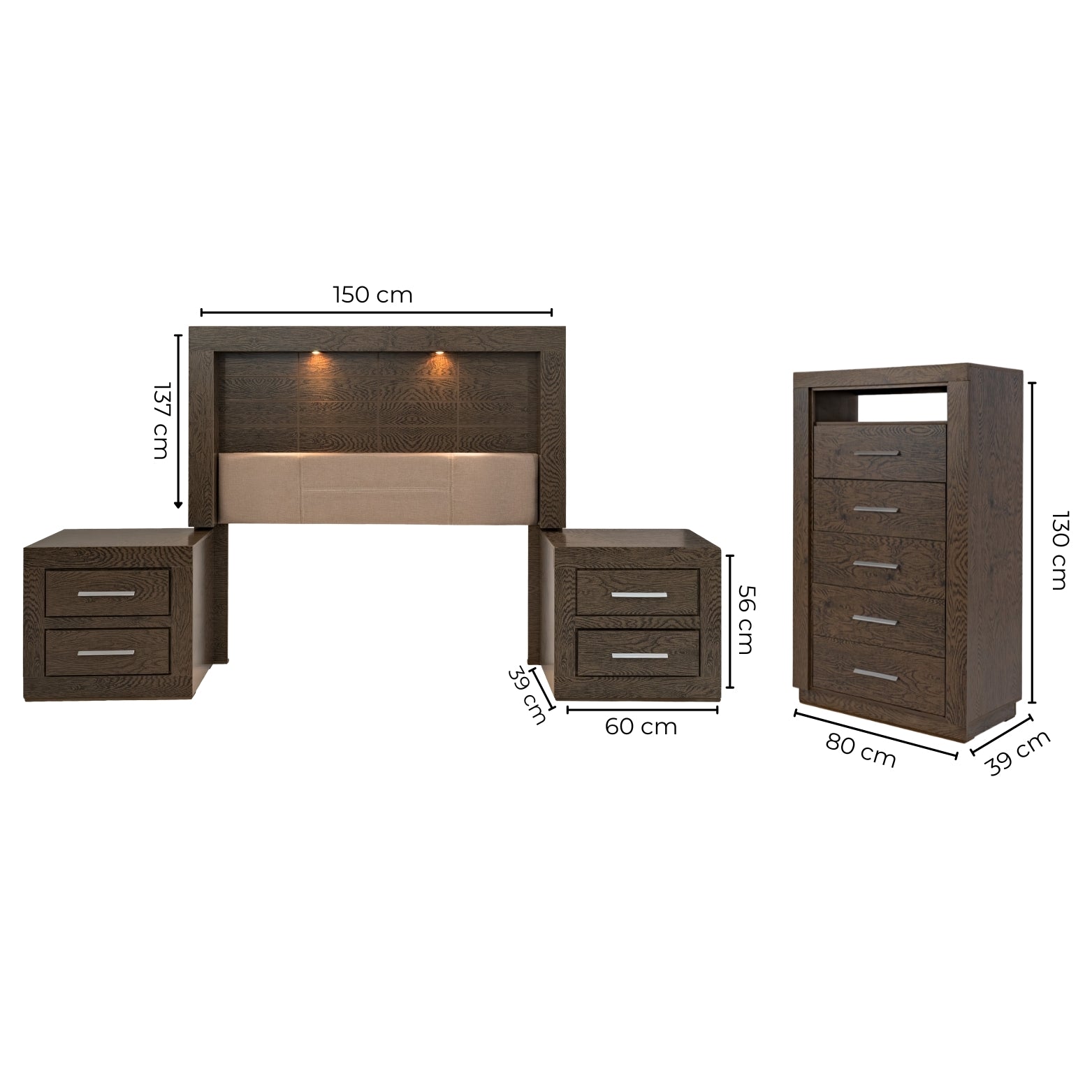 Descripción: Descubre la fusión perfecta entre elegancia y diseño con este set de recámara completa, que incluye: una cabecera con luz integrada, ideal para un colchón tamaño matrimonial; dos burós, cuyo diseño versátil y almacenamiento eficiente mantiene la armonía y el orden; y una amplia cómoda cajonera, para mantener todo organizado. Su diseño elegante y funcional aporta estilo y sofisticación al ambiente. Todos los productos fueron fabricados con materiales duraderos y un diseño atemporal. Se entregan completamente armados para su uso inmediato. Un conjunto perfecto para transformar tu dormitorio en un refugio con estilo y confort. No incluye base para cama ni colchón. |