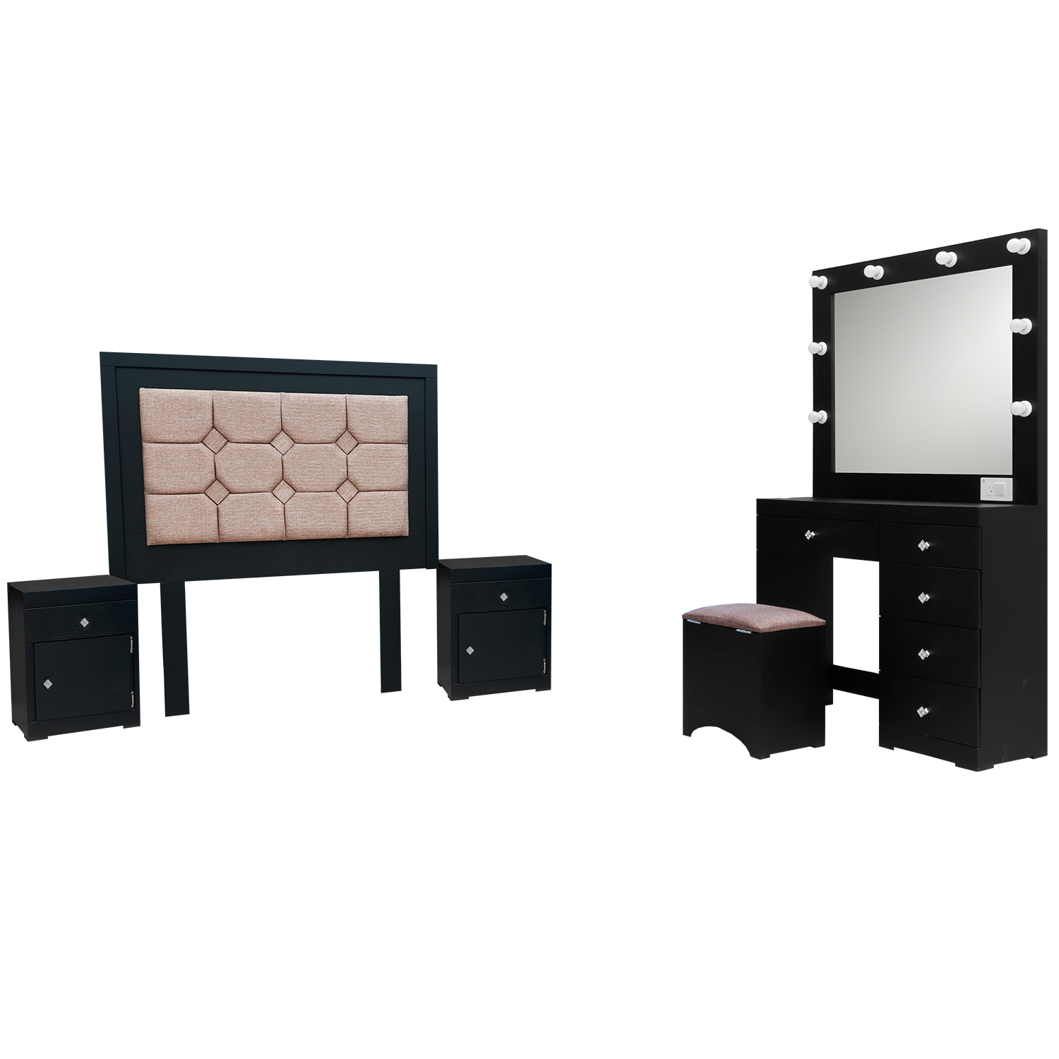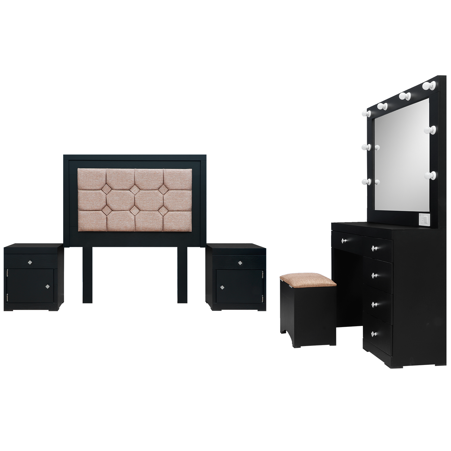 Descripción: Fabricado en Madera/Melamina. Con acabado en color Negro. Medidas: 140 x 145 x 9 cm. Medida Buro 48 x 58 x 36 Tocador 90 x 100 x 36 Espejo 90 x 100 x 5 Medida Taburete 40 x 40 x 30. No Incluye Base, colchon, ni accesorios. NOTA: Los accesorios y otros muebles de las fotografías, se venden por separado. Por efectos de iluminación de la fotografía, algunos tonos de colores pueden variar con respecto al color real. |
