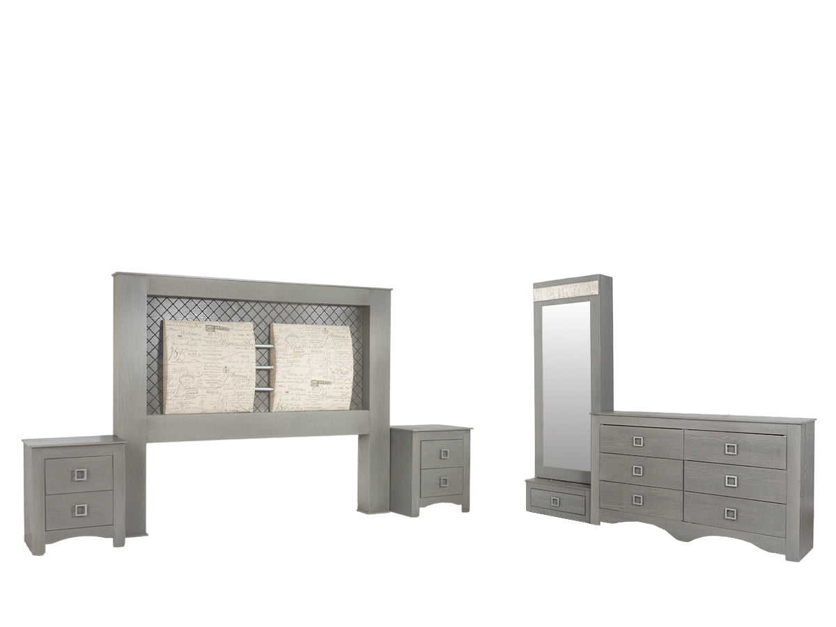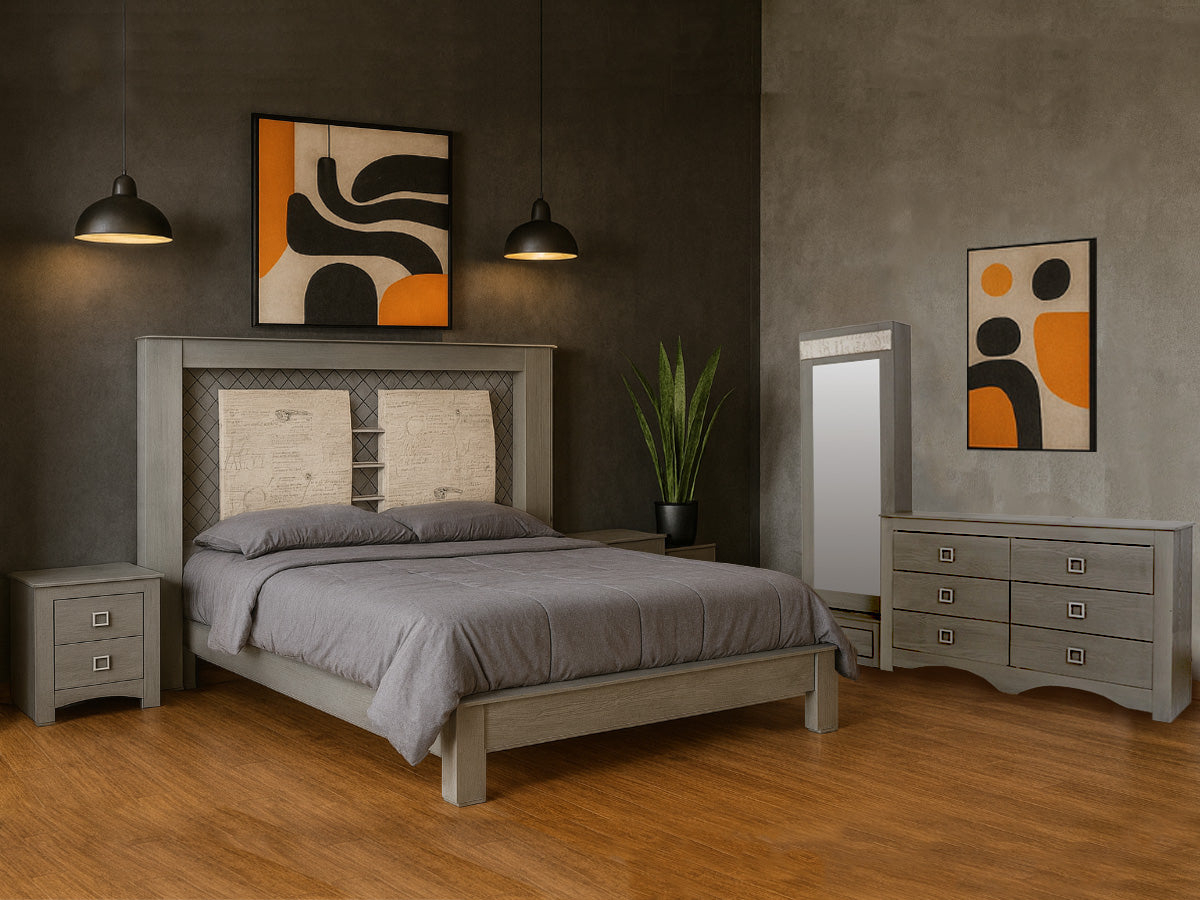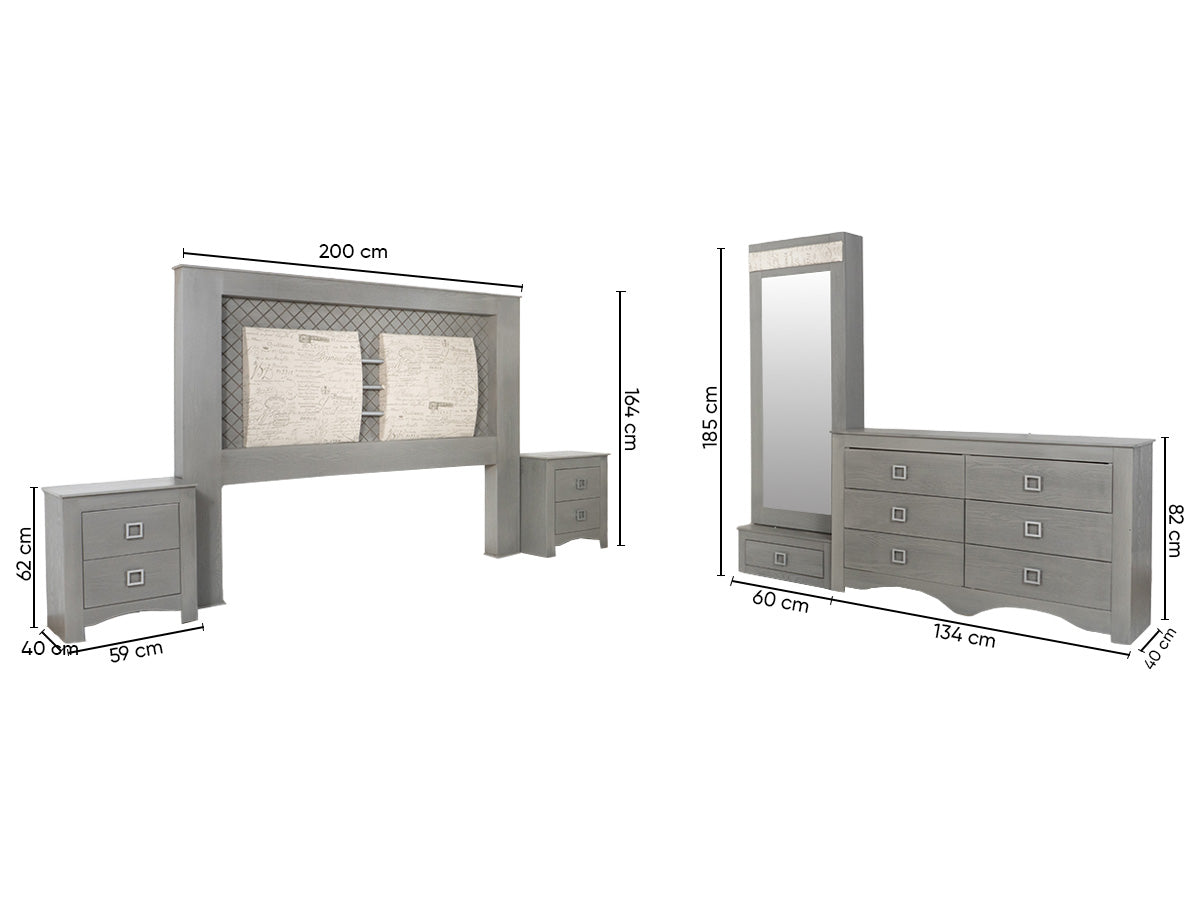 Descripción: Hermosa recamara de tamaño King Size. Fabricada en madera de pino estufada y tratada contra plagas y tablero industrializado de madera de pino con acabado semi brillante color gris. Incluye Cabecera, Buros, tocador y portaluna. NOTA: NO INCLUYE BASE NI COLCHON. Los accesorios y otros muebles de las fotografías, se venden por separado. Por efectos de iluminación de la fotografía, algunos tonos de colores pueden variar con respecto al color real. |