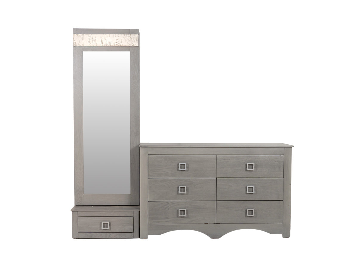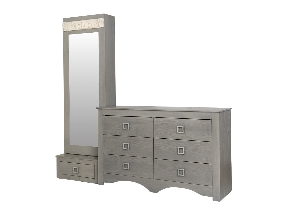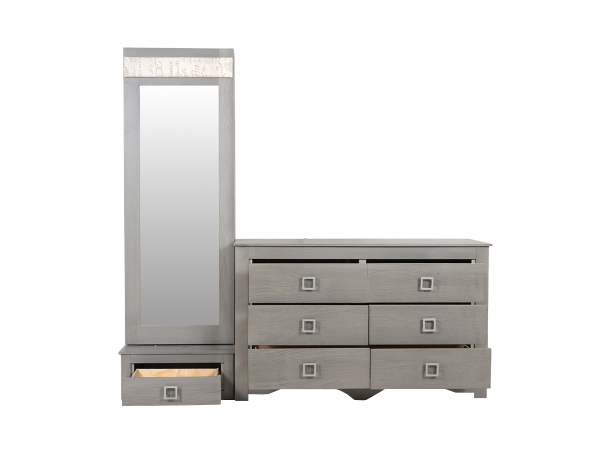 Descripción: Hermosa recamara de tamaño King Size. Fabricada en madera de pino estufada y tratada contra plagas y tablero industrializado de madera de pino con acabado semi brillante color gris. Incluye Cabecera, Buros, tocador y portaluna. NOTA: NO INCLUYE BASE NI COLCHON. Los accesorios y otros muebles de las fotografías, se venden por separado. Por efectos de iluminación de la fotografía, algunos tonos de colores pueden variar con respecto al color real. |