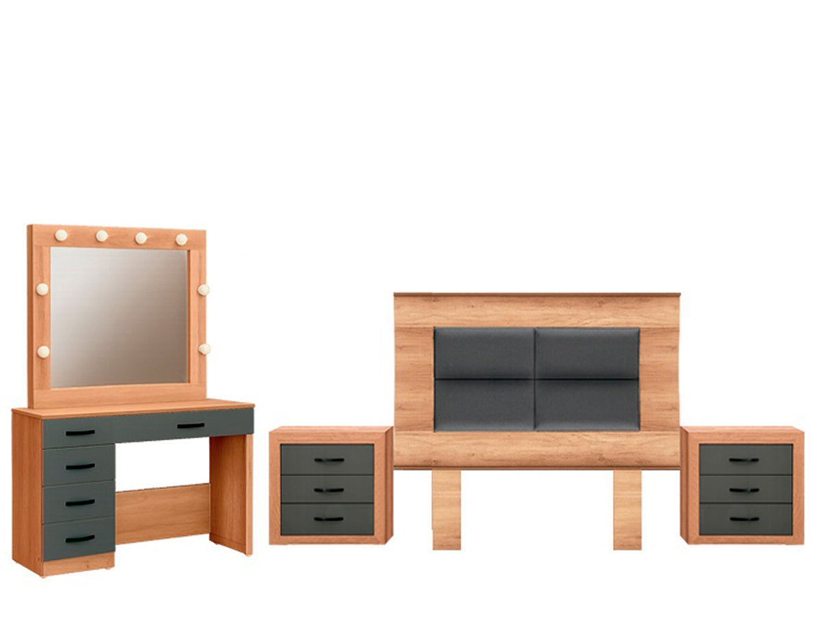Descripción: Fabricado en Madera y Melamina. Con acabado en color Roble. Medidas: 204 x 142 x 6 cm. Cabecera 204 x 142 x 6 Buro 58 x 62 x 39 Maquillador 120 x 170 x 39. No incluye base ni colchon. NOTA: Los accesorios y otros muebles de las fotografías, se venden por separado. Por efectos de iluminación de la fotografía, algunos tonos de colores pueden variar con respecto al color real. |
