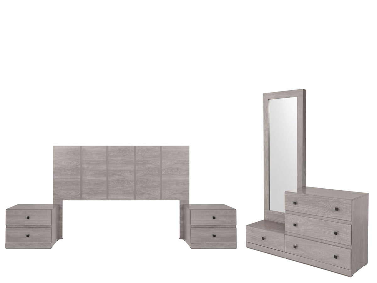 Descripción: Fabricado en Fabricado en Melamina de alta calidad para mayor durabilidad. Con acabado en color Gris. Medidas: 200 x 137 x 7 cm. Buro: 60 x 51 x 39. Cabecera: 200 x 137 x 7. Comoda: 80 x 75 x 39. Espejo: 60 x 160 x 39. Descubre la fusión perfecta entre elegancia y diseño con este set de recámara completa, que incluye: una cabecera, ideal para un colchón tamaño king; dos burós, cuyo diseño versátil y almacenamiento eficiente mantiene la armonía y el orden; una cómoda con espejo que también funciona como vanity o tocador, proporcionando el espacio perfecto para maquillarse, arreglarse o simplemente prepararse para el día. Su diseño elegante y funcional aporta estilo y sofisticación al ambiente. Todos los productos fueron fabricados con materiales duraderos y un diseño atemporal. Se entregan completamente armados para un uso inmediato. Un conjunto perfecto para transformar tu dormitorio en un refugio con estilo y confort.. BASE Y COLCHON NO INCLUIDOS.. NOTA: Los accesorios y otros muebles de las fotografías, se venden por separado. Por efectos de iluminación de la fotografía, algunos tonos de colores pueden variar con respecto al color real. |