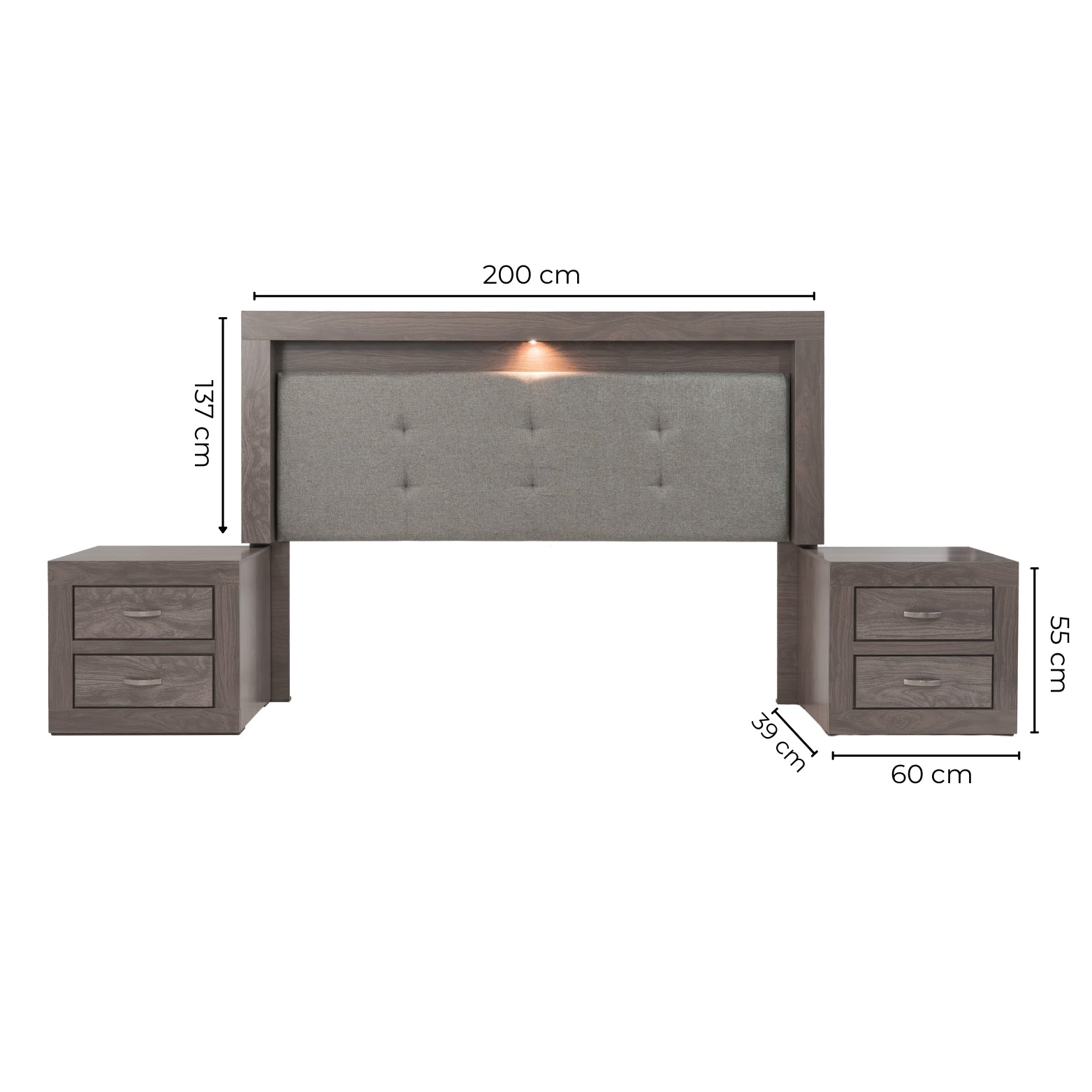 Descripción: Hermosa recamara de tamaño King Size. Fabricada en madera de pino estufada y tratada contra plagas y tablero industrializado de madera de pino con acabado semi brillante color gris. Medidas: Cabecera: 200 x 138 x 10.; buro: 40 x 56 x 40. Incluye: Cabecera y 2 Buros. NOTA: Incluye un foco en el centro de la cabecera. NO INCLUYE BASE NI COLCHON. Los accesorios y otros muebles de las fotografías, se venden por separado. Por efectos de iluminación de la fotografía, algunos tonos de colores pueden variar con respecto al color real. |