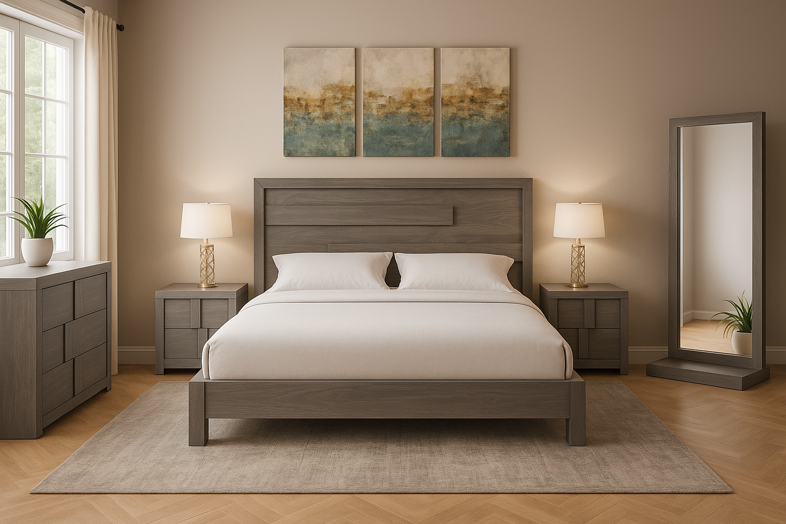 Transforma tu dormitorio con este set que incluye una cabecera y dos burós, fusionando estética y funcionalidad en un solo conjunto. La cabecera, diseñada para camas tamaño King Size, redefine el descanso con su estilo y acabados de alta calidad, aportando calidez y sofisticación a tu espacio. Las mesas de noche ofrecen almacenamiento eficiente y un diseño versátil que complementa perfectamente cualquier habitación. Fabricados con materiales duraderos y un estilo atemporal, se entregan completamente armados para un uso inmediato. Eleva tu hogar con un conjunto pensado para brindar distinción, orden y confort.