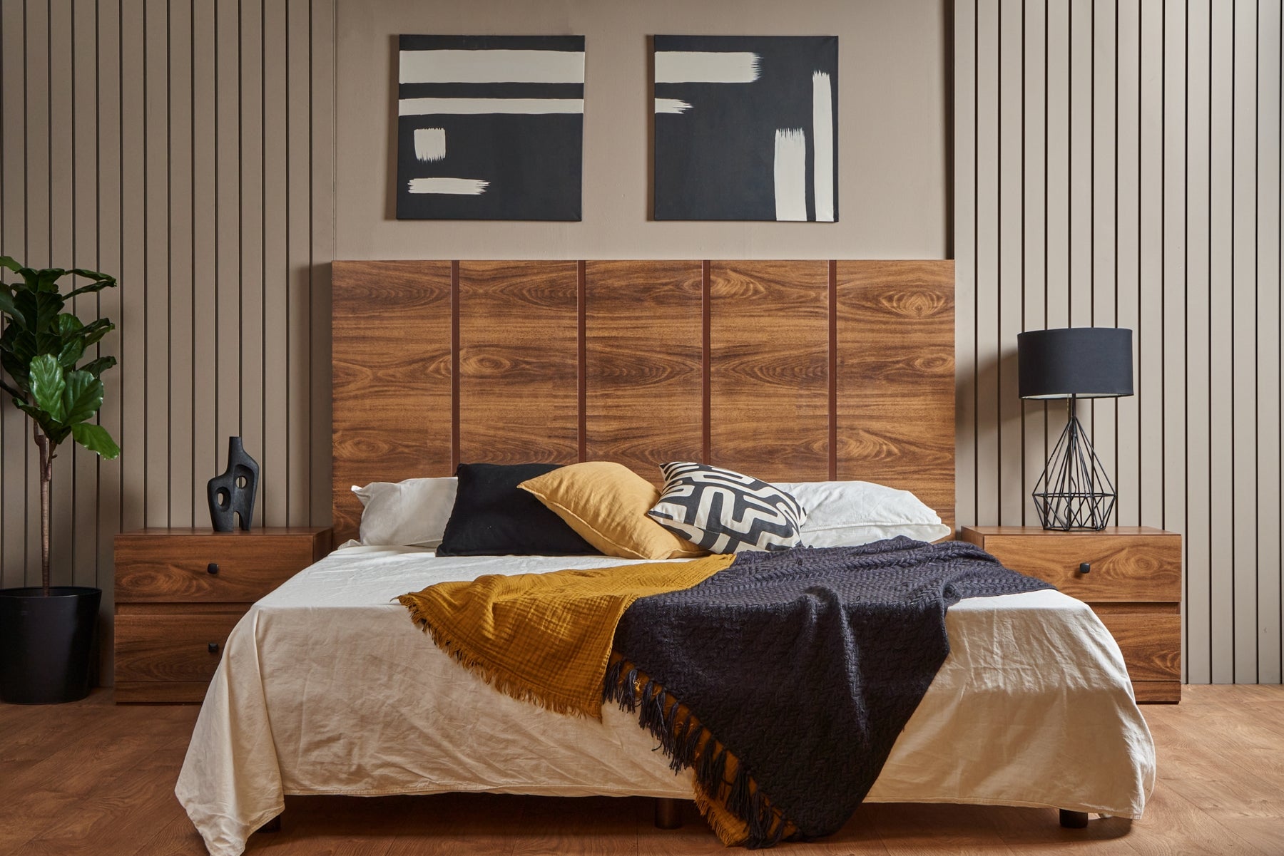 Descripción: Transforma tu dormitorio con este set que incluye una cabecera y dos burós, fusionando estética y funcionalidad en un sólo conjunto. La cabecera, diseñada para camas tamaño King Size, redefine el descanso con su estilo y acabados de alta calidad, aportando calidez y sofisticación a tu espacio. Las mesas de noche ofrecen almacenamiento eficiente y un diseño versátil que complementa perfectamente cualquier habitación. Este set crea un ambiente acogedor, organizado y lleno de elegancia. Fabricados con materiales duraderos y un estilo atemporal, se entregan completamente armados para un uso inmediato. El conjunto perfecto para un hogar lleno de distinción.. BASE Y COLCHON NO INCLUIDOS. |