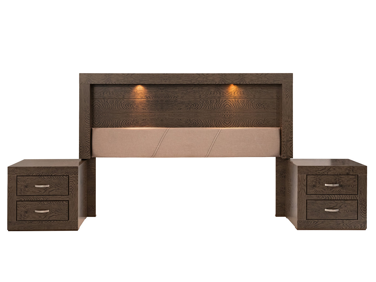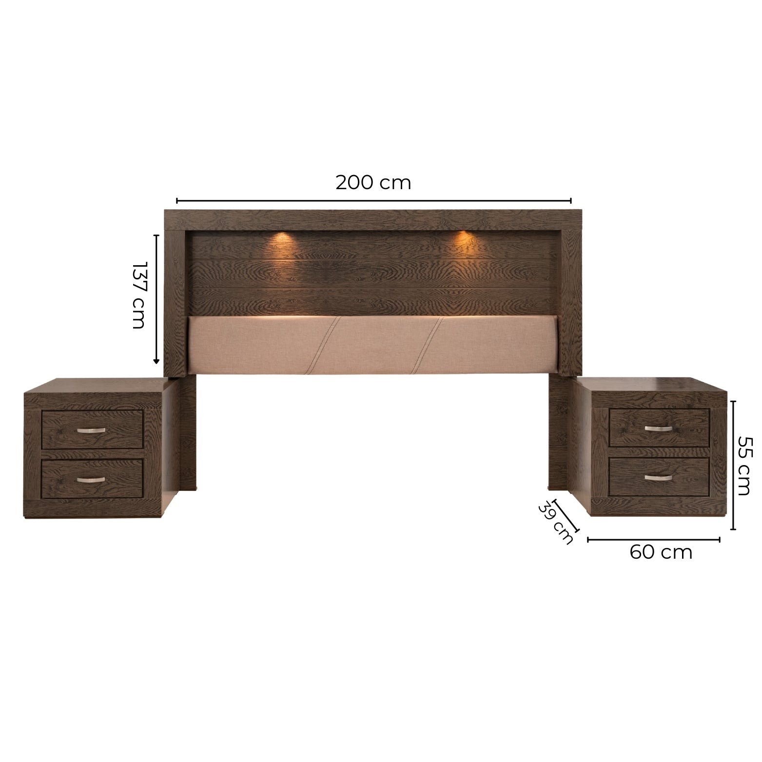 • Transforma tu dormitorio con este set que incluye una cabecera con luz integrada y dos burós, fusionando estética y funcionalidad en un solo conjunto. La cabecera, diseñada para camas tamaño King Size, redefine el descanso con su iluminación ambiental, estilo y acabados de alta calidad, aportando calidez y sofisticación a tu espacio. Los burós ofrecen almacenamiento eficiente y un diseño versátil que complementa perfectamente cualquier habitación. Fabricados con materiales duraderos y un estilo atemporal, se entregan completamente armados para un uso inmediato. Eleva tu hogar con un conjunto pensado para brindar distinción, orden y confort.