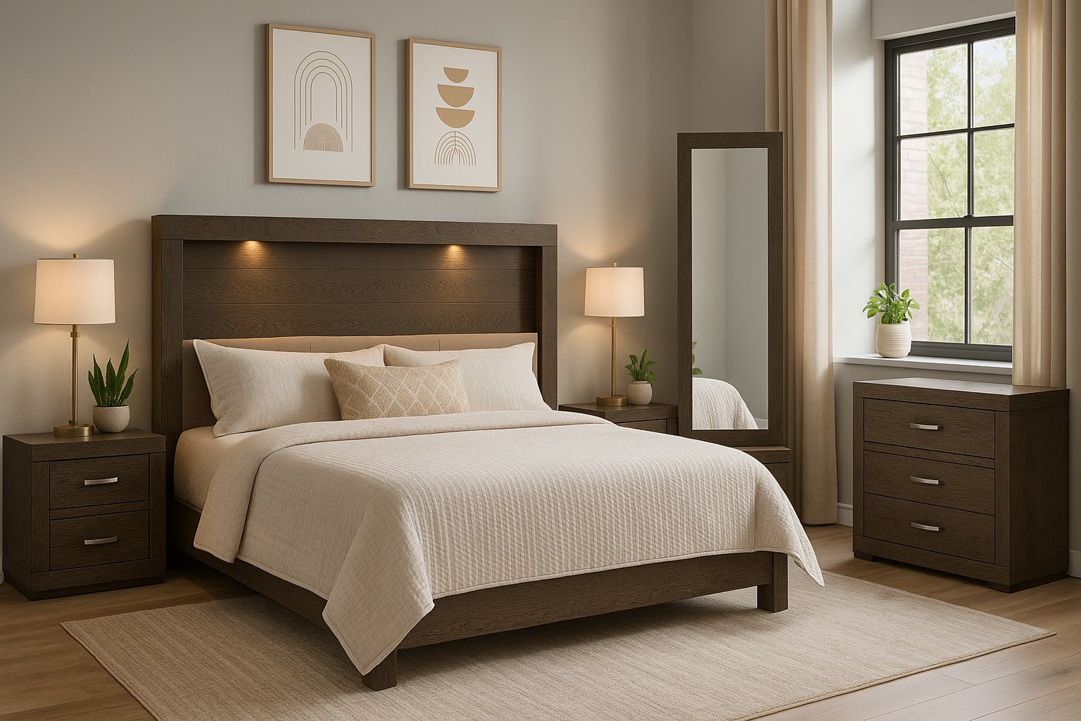 Transforma tu dormitorio con este set que incluye una cabecera con luz integrada y dos burós, fusionando estética y funcionalidad en un solo conjunto. La cabecera, diseñada para camas tamaño King Size, redefine el descanso con su iluminación ambiental, estilo y acabados de alta calidad, aportando calidez y sofisticación a tu espacio. Los burós ofrecen almacenamiento eficiente y un diseño versátil que complementa perfectamente cualquier habitación. Fabricados con materiales duraderos y un estilo atemporal, se entregan completamente armados para un uso inmediato. Eleva tu hogar con un conjunto pensado para brindar distinción, orden y confort.