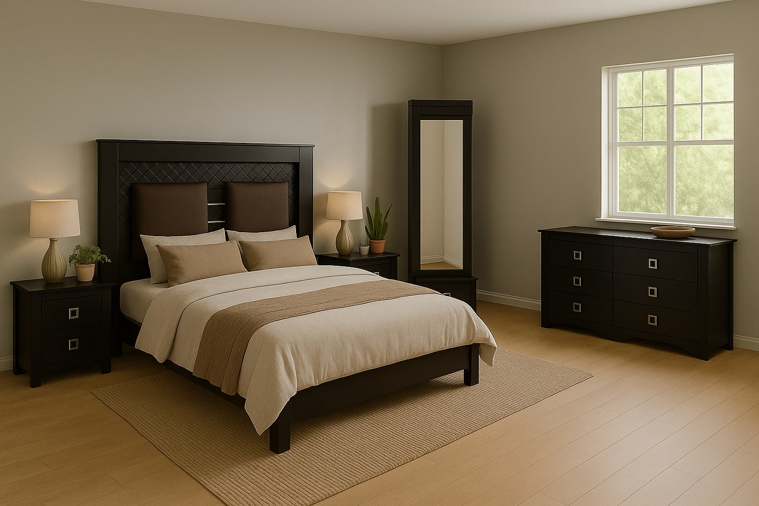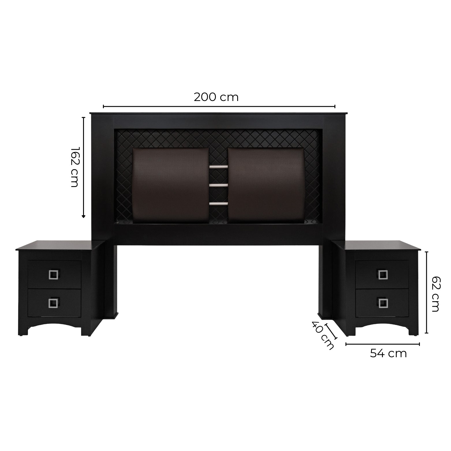 • Transforma tu dormitorio con este set que incluye una cabecera y dos burós, fusionando estética y funcionalidad en un solo conjunto. La cabecera, diseñada para camas tamaño King Size, redefine el descanso con su estilo y acabados de alta calidad, aportando calidez y sofisticación a tu espacio. Las mesas de noche ofrecen almacenamiento eficiente y un diseño versátil que complementa perfectamente cualquier habitación. Fabricados con materiales duraderos y un estilo atemporal, se entregan completamente armados para un uso inmediato. Eleva tu hogar con un conjunto pensado para brindar distinción, orden y confort.