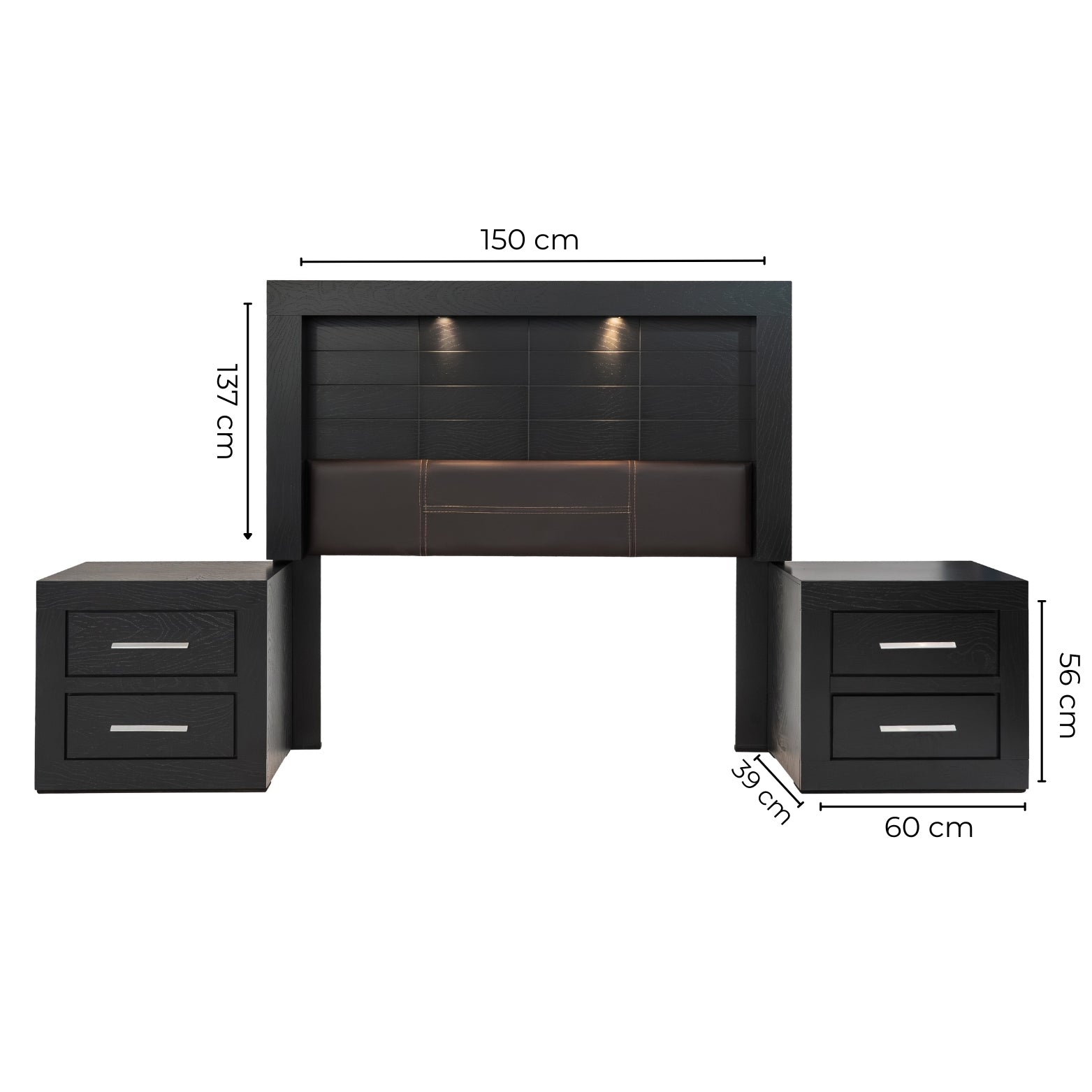 Descripción: Hermosa recamara de tamaño King Size. Fabricada en madera de pino estufada y tratada contra plagas y tablero industrializado de madera de pino con acabado semi brillante color chocolate. Medidas: Cabecera: 140 x 157 x 5.; buro: 55 x 56 x 40. Incluye Cabecera y 2 Buros. NOTA: NO INCLUYE BASE NI COLCHON. Los accesorios y otros muebles de las fotografías, se venden por separado. Por efectos de iluminación de la fotografía, algunos tonos de colores pueden variar con respecto al color real. |
