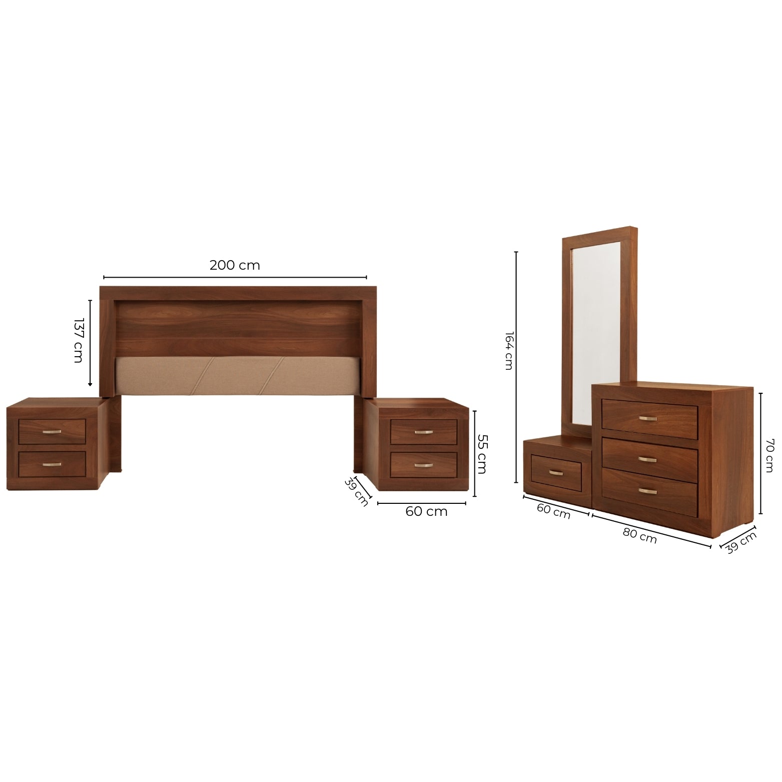 Descripción: Fabricado en Madera/Melamina. Con acabado en color Parota. Medidas: 200 x 138 x 10 cm. Medida Buro 61 x 55 x 40 Tocador 81 x 71 x 40 Portaluna 61 x 34 x 40 Espejo 61 x 131 x 40. No Incluye Base, colchon, ni accesorios. NOTA: Los accesorios y otros muebles de las fotografías, se venden por separado. Por efectos de iluminación de la fotografía, algunos tonos de colores pueden variar con respecto al color real. |