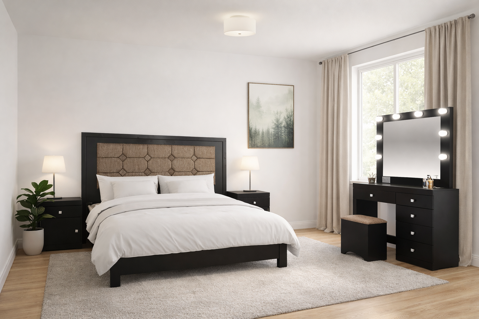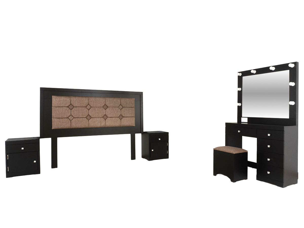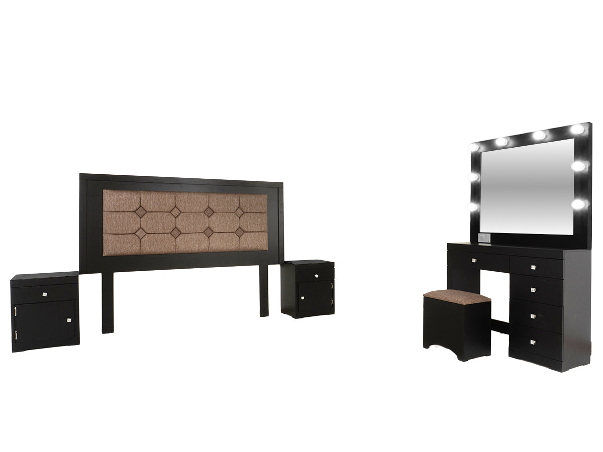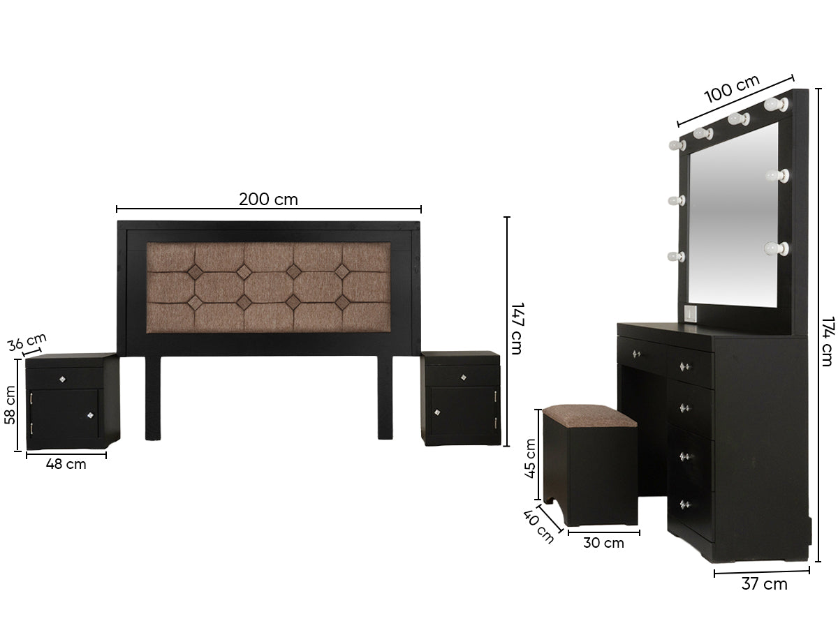 Descripción: Fabricado en Madera/Melamina. Con acabado en color Negro. Medidas: 200 x 147 x 7 cm. Medida Buro 48 x 58 x 36 Tocador 90 x 100 x 36 Espejo 90 x 100 x 5 Medida Taburete 40 x 40 x 30. No Incluye Base, colchon, ni accesorios. NOTA: Los accesorios y otros muebles de las fotografías, se venden por separado. Por efectos de iluminación de la fotografía, algunos tonos de colores pueden variar con respecto al color real. |