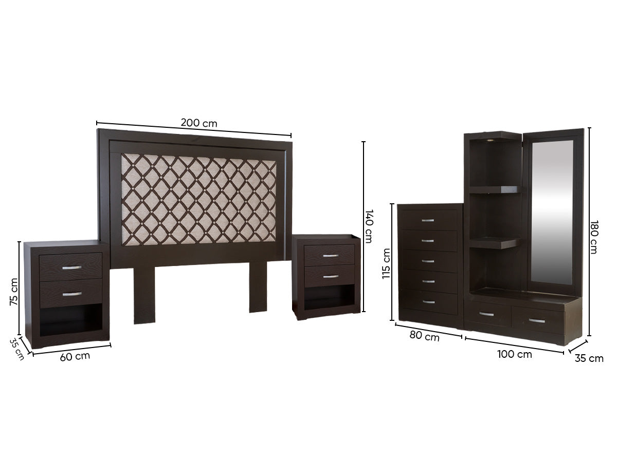 Descripción: Fabricado en Madera/Melamina. Con acabado en color Nogal. Medidas: 200 x 160 x 7 cm. Medida Buro 60 x 75 x 35 Tocador 80 x 115 x 35 Espejo 100 x 180 x 35. No Incluye Base, colchon, ni accesorios. NOTA: Los accesorios y otros muebles de las fotografías, se venden por separado. Por efectos de iluminación de la fotografía, algunos tonos de colores pueden variar con respecto al color real. |