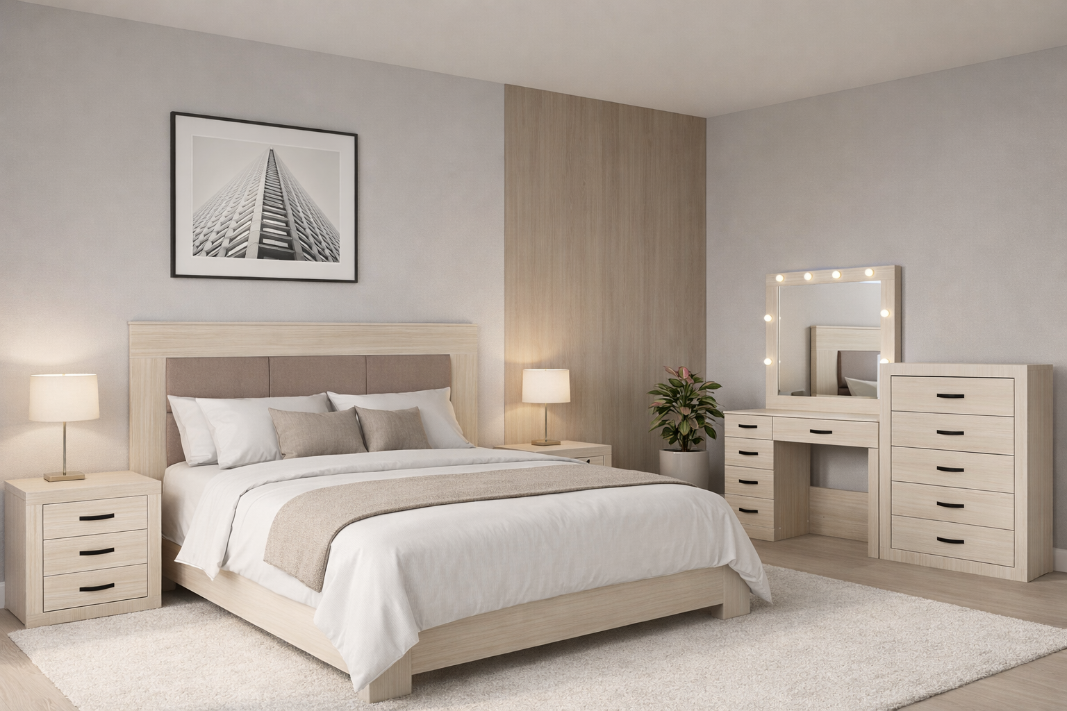 Descripción: Fabricado en Madera y Melamina. Con acabado en color Blanco. Medidas: 204 x 142 x 6 cm. Cabecera 204 x 142 x 6 Buro 58 x 62 x 39 Cajonera 90 x 110 x 39 Maquillador 120 x 170 x 39. No incluye base ni colchon. NOTA: Los accesorios y otros muebles de las fotografías, se venden por separado. Por efectos de iluminación de la fotografía, algunos tonos de colores pueden variar con respecto al color real. |