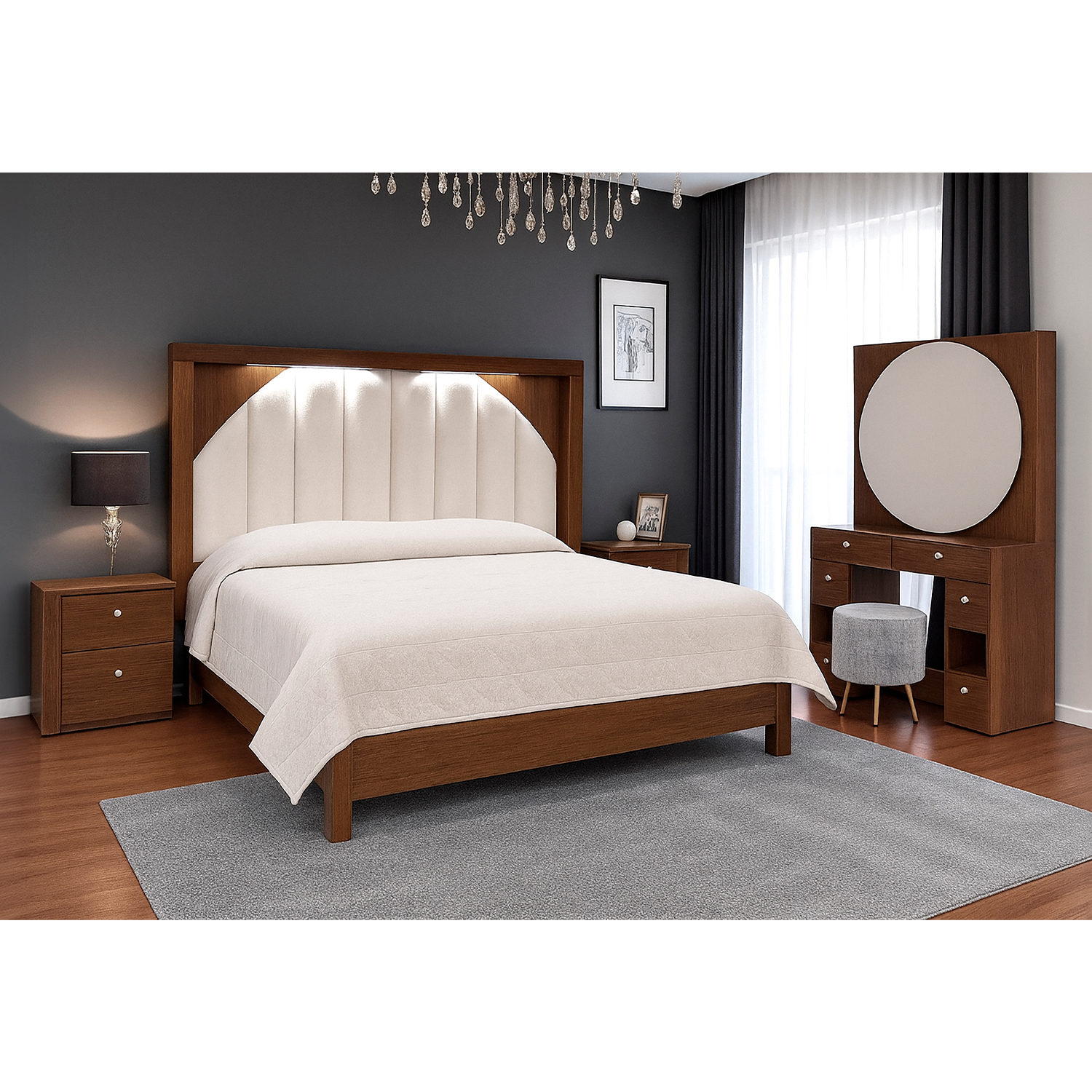 Fabricado en Madera y Melamina. Con acabado en color Nogal. Medidas: 200 x 172 x 9 cm. Cabecera 200 x 172 x 9 Buro 60 x 62 x 36 Maquillador 100 x 175 x 37. No incluye base, colchon y taburete. NOTA: Los accesorios y otros muebles de las fotografías, se venden por separado. Por efectos de iluminación de la fotografía, algunos tonos de colores pueden variar con respecto al color real.