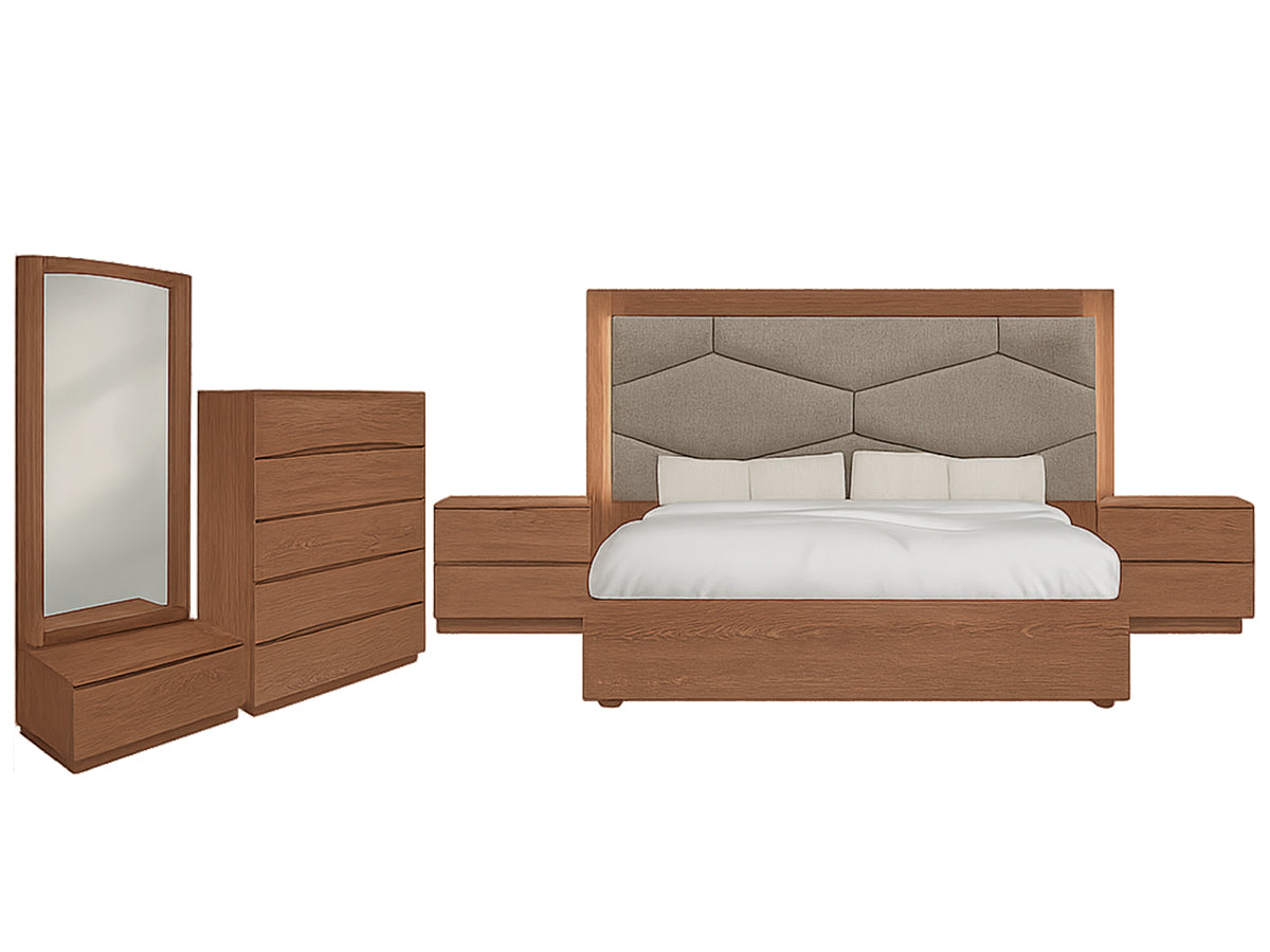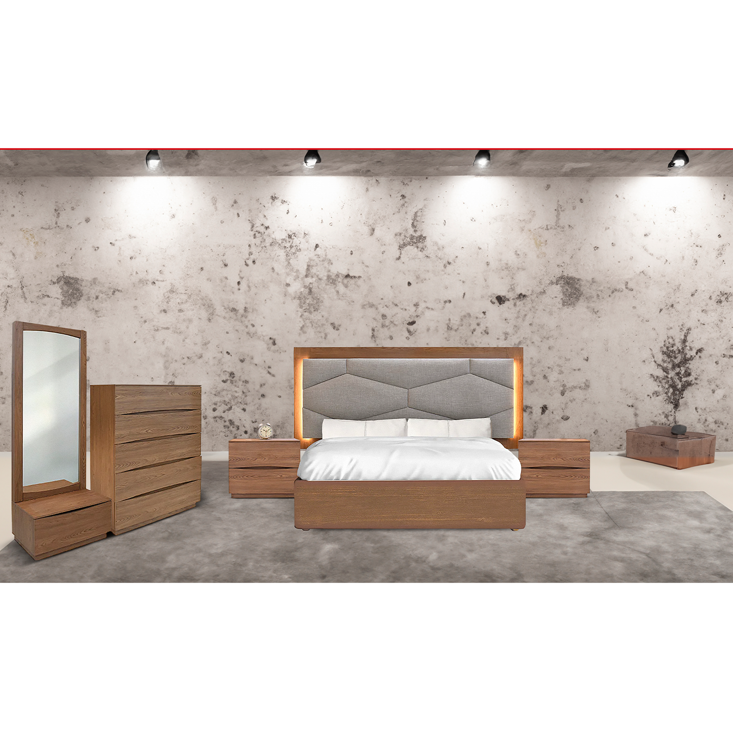 Fabricado en Madera y Melamina. Con acabado en color Nogal. Medidas: 200 x 148 x 5 cm. Cabecera 200 x 148 x 5 Buro 70 x 60 x 40 Tocador 90 x 120 x 40 Portaluna 70 x 60 x 40 Espejo 70 x 146 x 7. No incluye base ni colchon. NOTA: Los accesorios y otros muebles de las fotografías, se venden por separado. Por efectos de iluminación de la fotografía, algunos tonos de colores pueden variar con respecto al color real.