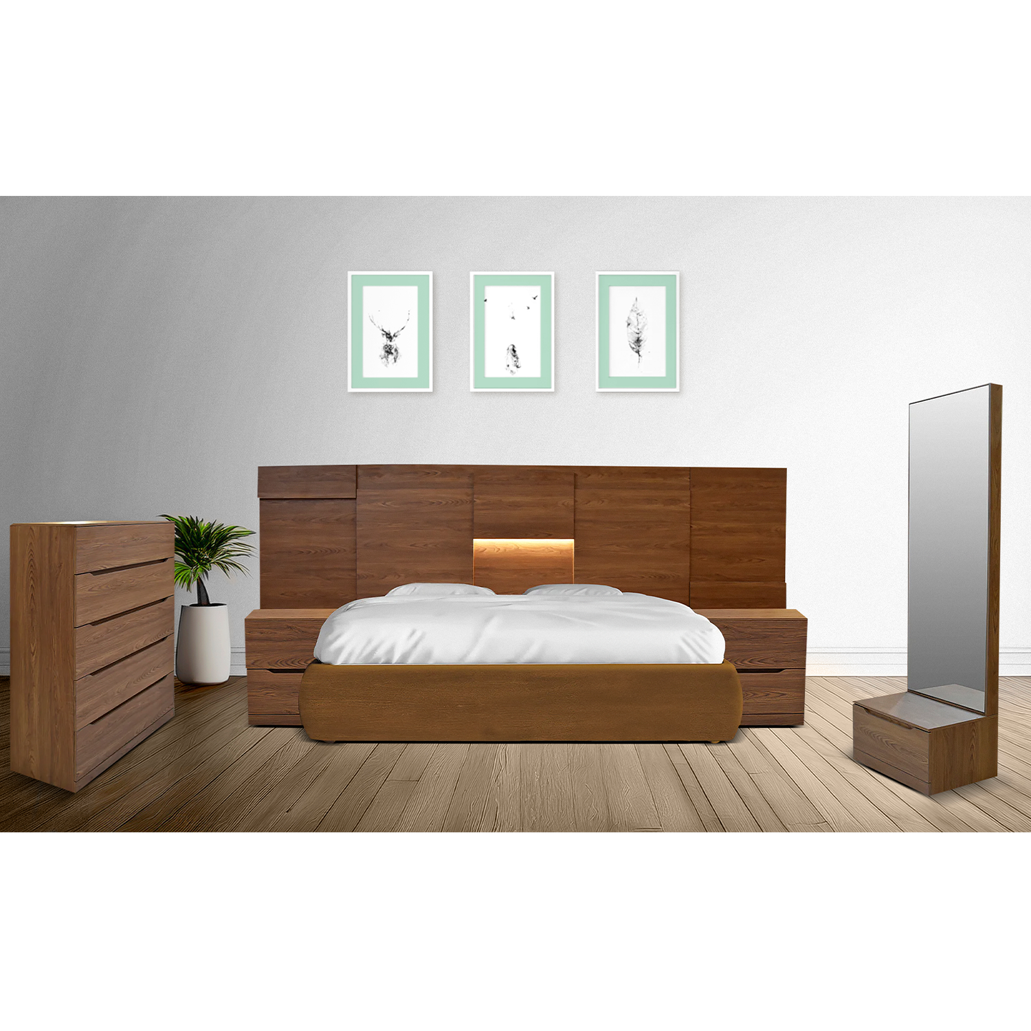 Fabricado en Madera y Melamina. Con acabado en color Nogal. Medidas: 320 x 148 x 10 cm. Cabecera 320 x 148 x 10 Buro 60 x 54 x 40 Tocador 100 x 130 x 40 Portaluna 60 x 30 x 40 Espejo 60 x 146 x 8. No incluye base ni colchon. NOTA: Los accesorios y otros muebles de las fotografías, se venden por separado. Por efectos de iluminación de la fotografía, algunos tonos de colores pueden variar con respecto al color real.