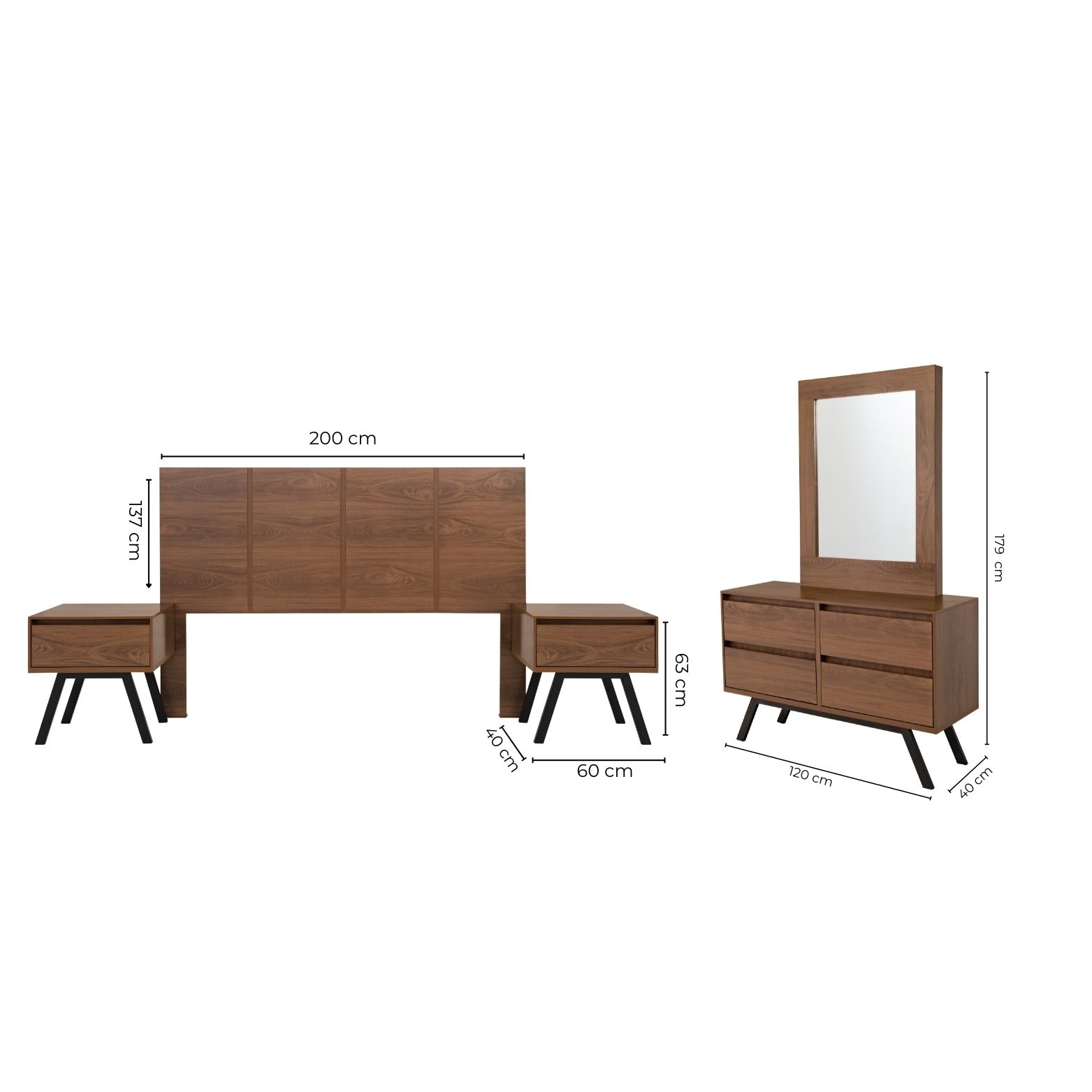 Descripción: Fabricado en Fabricado en Melamina de alta calidad para mayor durabilidad. Con acabado en color Nogal. Medidas: 200 x 137 x 7 cm. Cabecera: 200 x 137 x 7. Buro: 60 x 63 x 40. Cajonera con espejo: 120 x 179 x 40. Descubre la fusión perfecta entre elegancia y diseño con este set de recámara completa, que incluye: una cabecera, ideal para un colchón tamaño king; dos burós, cuyo diseño versátil y almacenamiento eficiente mantiene la armonía y el orden; una cómoda y espejo que también funciona como vanity o tocador, proporcionando el espacio perfecto para maquillarse, arreglarse o simplemente prepararse para el día. Su diseño elegante y funcional aporta estilo y sofisticación al ambiente. Todos los productos fueron fabricados con materiales duraderos y un diseño atemporal. Se entregan completamente armados para un uso inmediato. Un conjunto perfecto para transformar tu dormitorio en un refugio con estilo y confort. No incluye base para cama ni colchón.. NOTA: Los accesorios y otros muebles de las fotografías, se venden por separado. Por efectos de iluminación de la fotografía, algunos tonos de colores pueden variar con respecto al color real. |