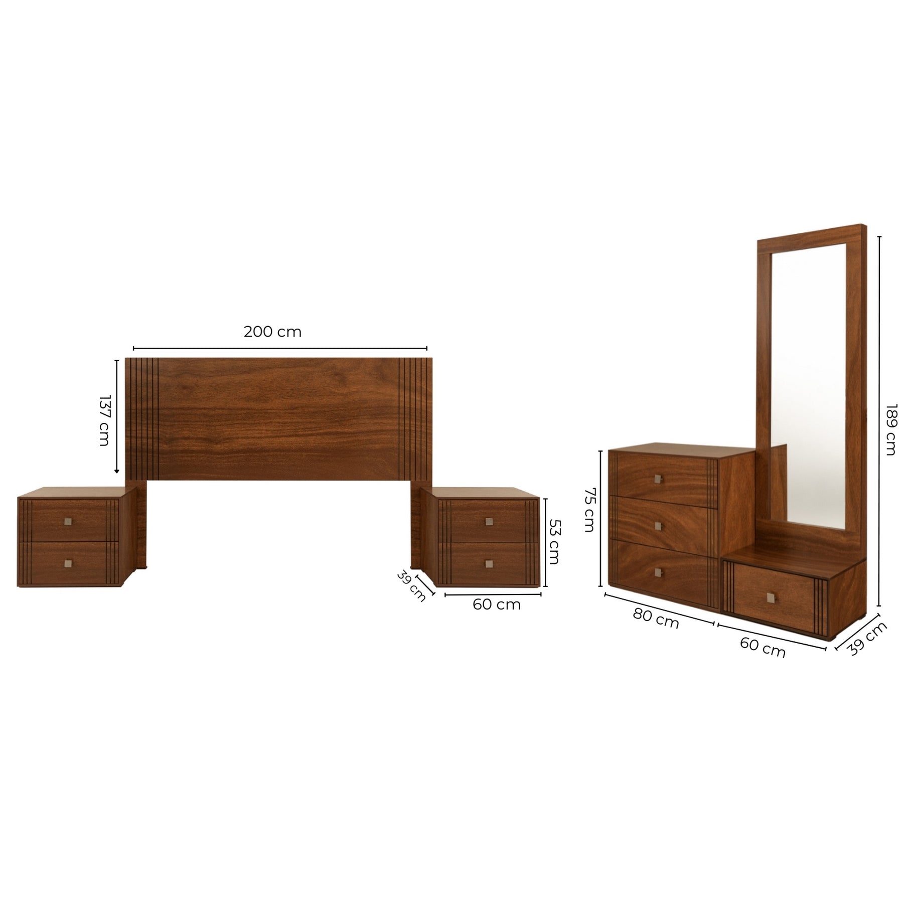 Descripción: Descubre la fusión perfecta entre elegancia y diseño con este set de recámara completa, que incluye: una cabecera, ideal para un colchón tamaño king; dos burós, cuyo diseño versátil y almacenamiento eficiente mantiene la armonía y el orden; una cómoda y espejo que también funciona como vanity o tocador, proporcionando el espacio perfecto para maquillarse, arreglarse o simplemente prepararse para el día. Su diseño elegante y funcional aporta estilo y sofisticación al ambiente. Todos los productos fueron fabricados con materiales duraderos y un diseño atemporal. Se entregan completamente armados para un uso inmediato. Un conjunto perfecto para transformar tu dormitorio en un refugio con estilo y confort.. BASE Y COLCHON NO INCLUIDOS. |