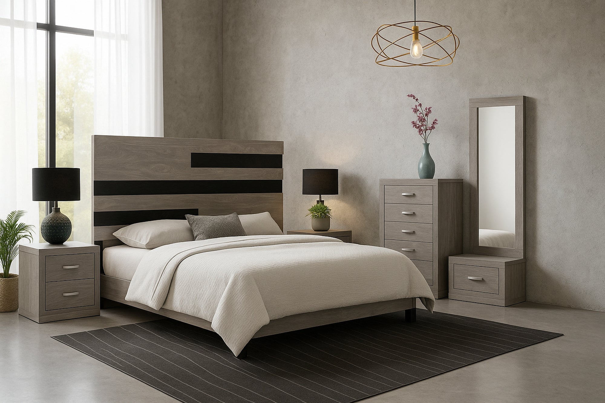 Descripción: Descubre la fusión perfecta entre elegancia y diseño con este set de recámara completa, que incluye: una cabecera, ideal para un colchón tamaño king; dos burós, cuyo diseño versátil y almacenamiento eficiente mantiene la armonía y el orden; una cómoda con espejo que también funciona como vanity o tocador, proporcionando el espacio perfecto para maquillarse, arreglarse o simplemente prepararse para el día. Su diseño elegante y funcional aporta estilo y sofisticación al ambiente. Todos los productos fueron fabricados con materiales duraderos y un diseño atemporal. Se entregan completamente armados para un uso inmediato. Un conjunto perfecto para transformar tu dormitorio en un refugio con estilo y confort. No incluye base para la cama. |