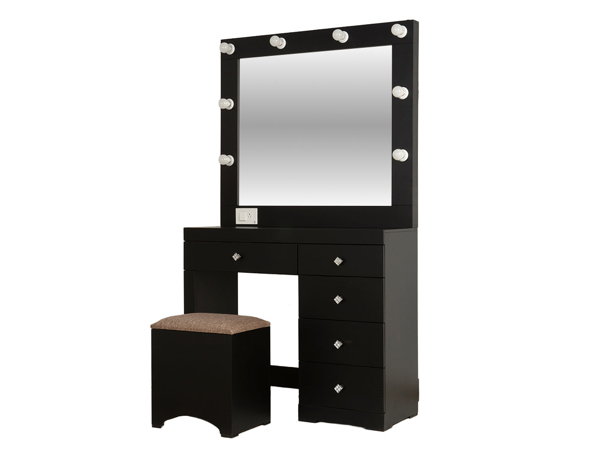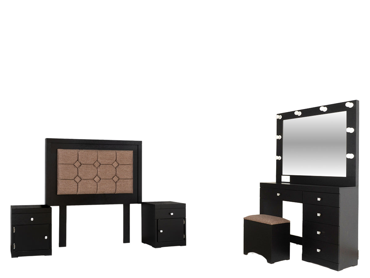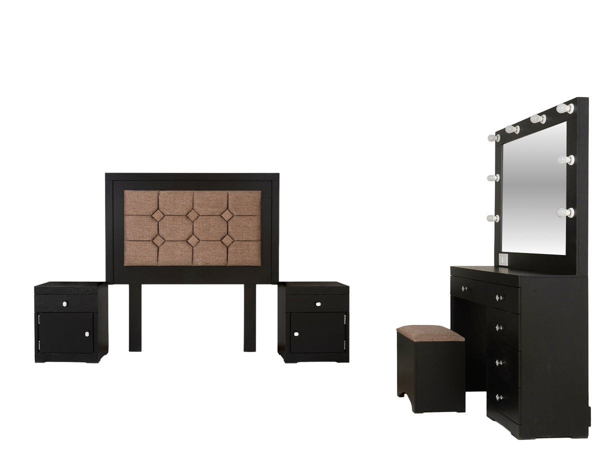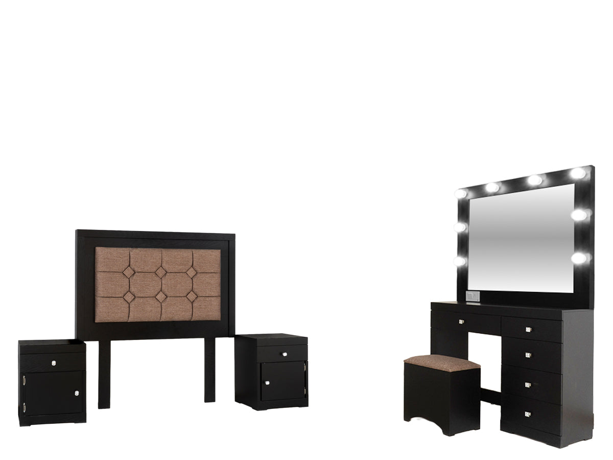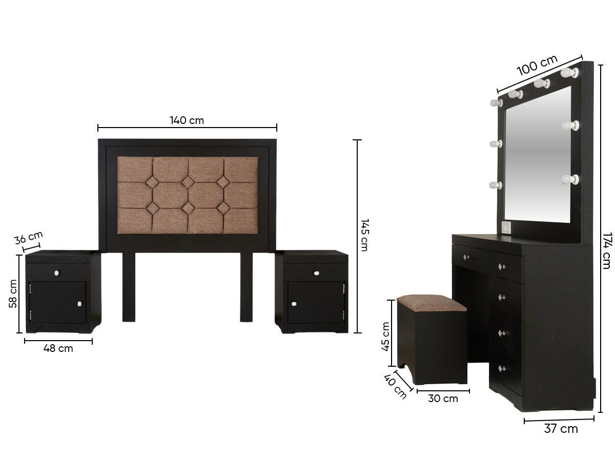 Descripción: Fabricado en Madera/Melamina. Con acabado en color Negro. Medidas: 140 x 145 x 9 cm. Medida Buro 48 x 58 x 36 Tocador 90 x 100 x 36 Espejo 90 x 100 x 5 Medida Taburete 40 x 40 x 30. No Incluye Base, colchon, ni accesorios. NOTA: Los accesorios y otros muebles de las fotografías, se venden por separado. Por efectos de iluminación de la fotografía, algunos tonos de colores pueden variar con respecto al color real. |