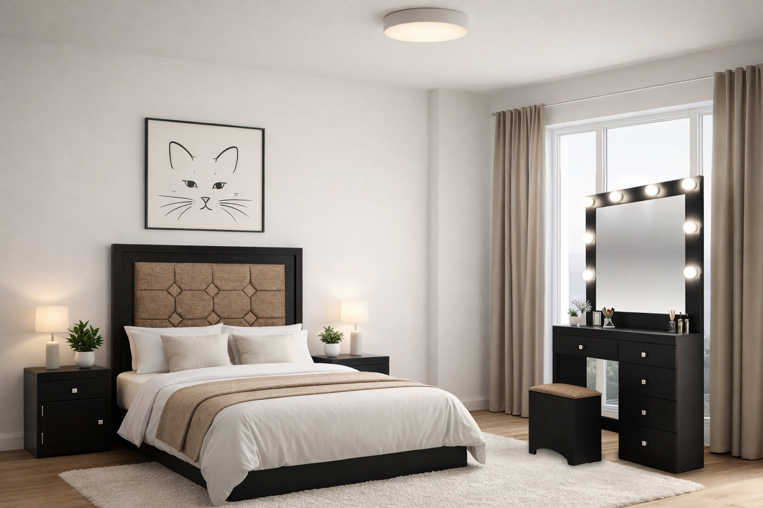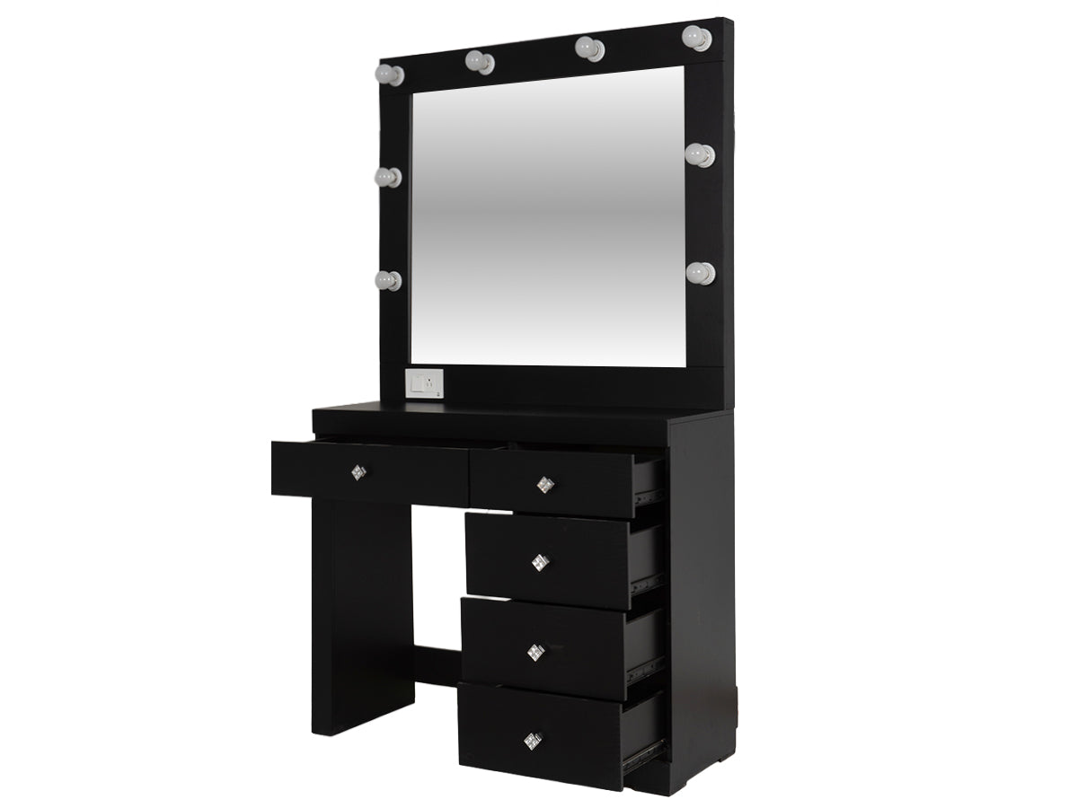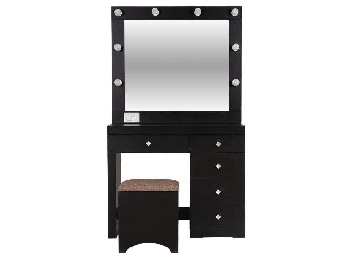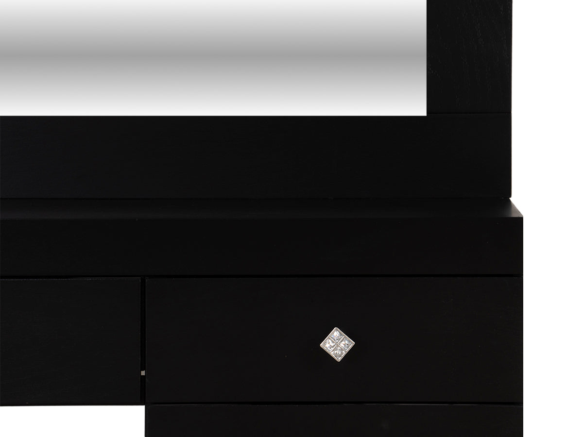 Descripción: Fabricado en Madera/Melamina. Con acabado en color Negro. Medidas: 140 x 145 x 9 cm. Medida Buro 48 x 58 x 36 Tocador 90 x 100 x 36 Espejo 90 x 100 x 5 Medida Taburete 40 x 40 x 30. No Incluye Base, colchon, ni accesorios. NOTA: Los accesorios y otros muebles de las fotografías, se venden por separado. Por efectos de iluminación de la fotografía, algunos tonos de colores pueden variar con respecto al color real. |