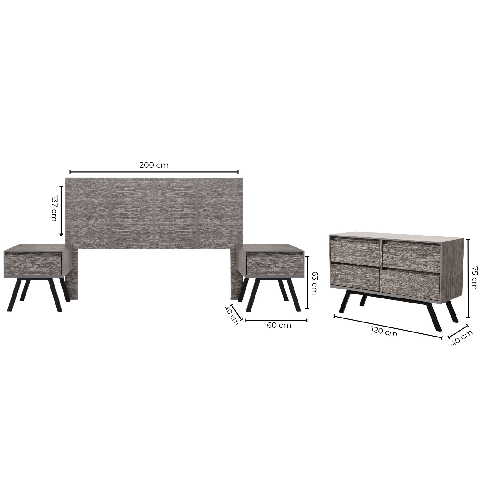 Descripción: Fabricado en Fabricado en Melamina de alta calidad para mayor durabilidad. Con acabado en color Gris. Medidas: 200 x 137 x 7 cm. Cabecera: 200 x 137 x 7. Buro: 60 x 63 x 40. Cajonera: 120 x 75 x 40. Descubre la fusión perfecta entre elegancia y diseño con este set de recámara completa, que incluye: una cabecera, ideal para un colchón tamaño king; dos burós, cuyo diseño versátil y almacenamiento eficiente mantiene la armonía y el orden; y una amplia cómoda cajonera, para mantener todo organizado. Su diseño elegante y funcional aporta estilo y sofisticación al ambiente. Todos los productos fueron fabricados con materiales duraderos y un diseño atemporal. Se entregan completamente armados para su uso inmediato. Un conjunto perfecto para transformar tu dormitorio en un refugio con estilo y confort. No incluye base para cama ni colchón.. NOTA: Los accesorios y otros muebles de las fotografías, se venden por separado. Por efectos de iluminación de la fotografía, algunos tonos de colores pueden variar con respecto al color real. |